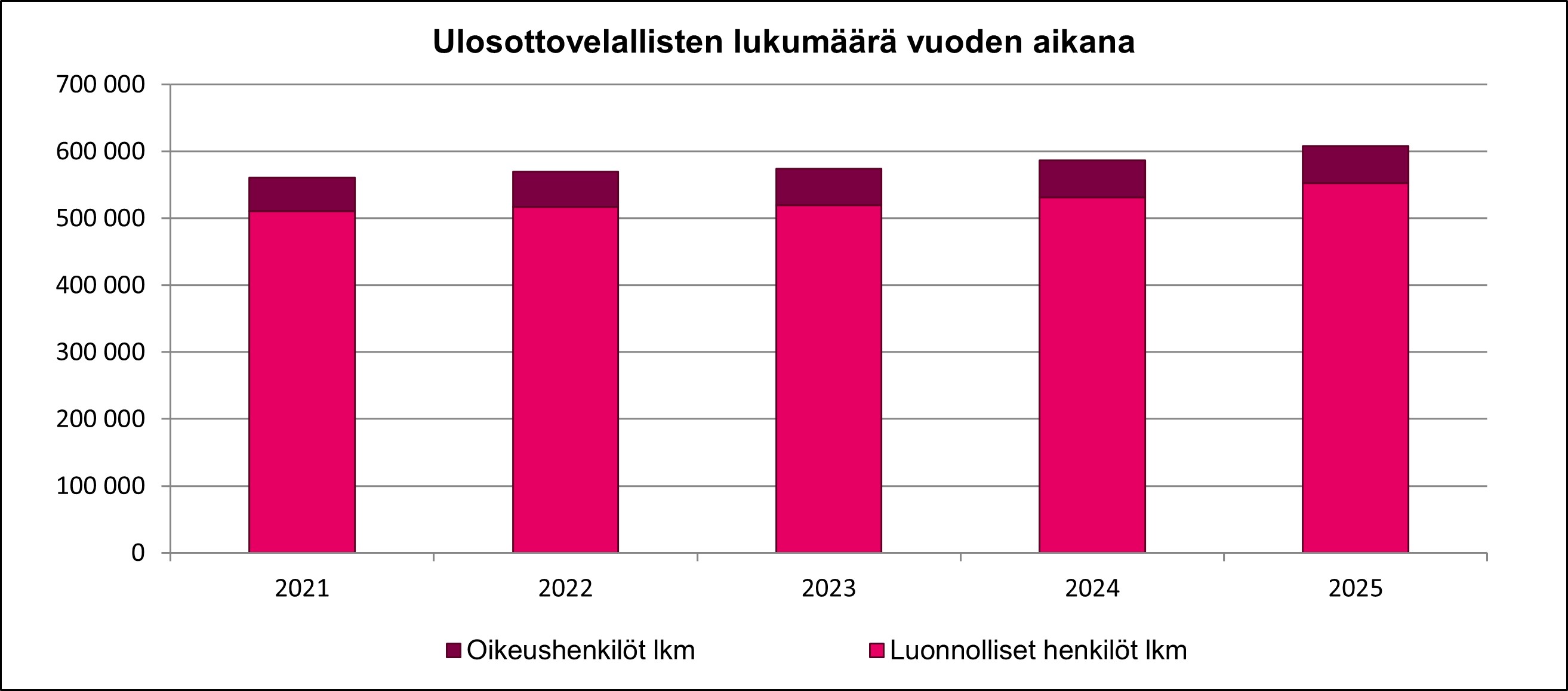 Ulosottovelallisten yhteismäärä ylitti vuonna 2025 ensimmäisen kerran 600 000 eri velallisen rajan. Velallisia oli ulosoton asiakkaana viime vuoden aikana yhteensä hieman yli 608 000. Velallisten määrä kasvoi edellisvuodesta 3,7 prosenttia. Lukumäärä kuvaa saman vuoden aikana ulosotossa olleita henkilö- ja yritysvelallisia. Samanaikaisesti ulosotossa on yksittäisenä ajankohtana tarkasteltuna keskimäärin noin 269 000 velallista.