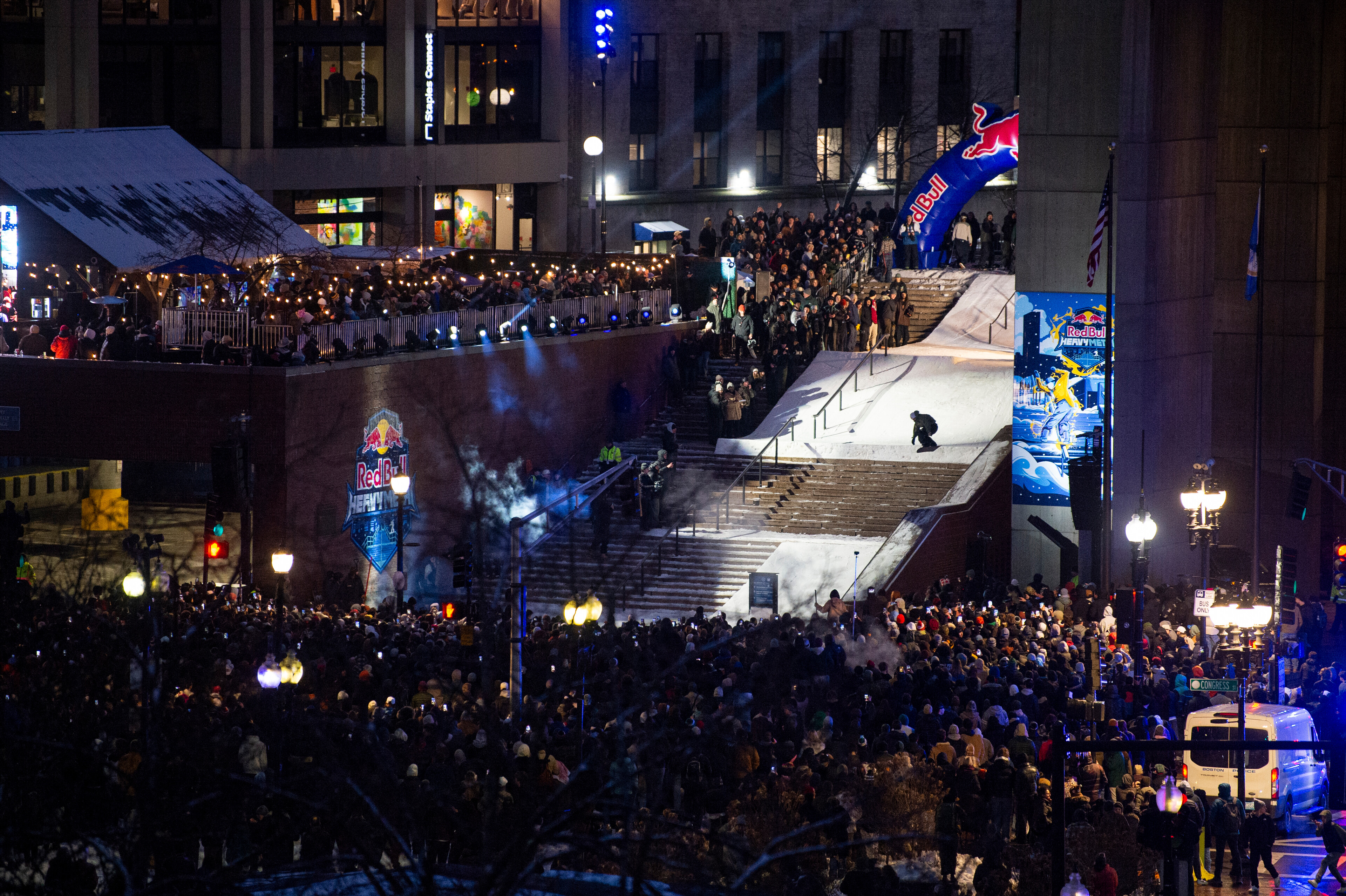Maailman parhaat katulumilautailijat kisasivat lauantaina 21.2. Bostonin kaupungintalon aukiolla Red Bull Heavy Metal 2026 -tapahtumakiertueen ensimmäisellä etapilla. Aukiolle tuotiin jopa 150 tonnia lunta, josta rakennettiin kisan kolme laskualuetta kaupungin kaiteiden, portaiden ja tiiliseinien ympärille.