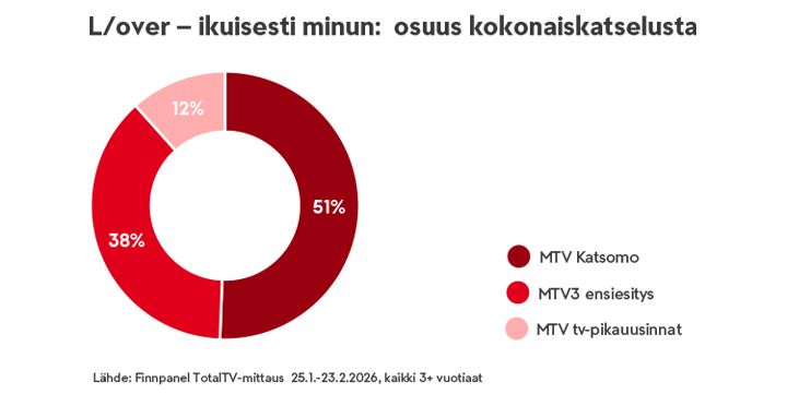 Finnpanelin TotalTV-mittauksen mukaan MTV:n hyytävä uutuusdraama L/over – ikuisesti minun on tällä hetkellä Suomen katsotuin kotimainen draama: ohjelma on tavoittanut jo kaksi miljoonaa suomalaista. Se on Finnpanelin TotalTV-mittauksen mukaan katsotuin kotimainen draama myös pelkissä suoratoistopalvelujen katseluluvuissa: