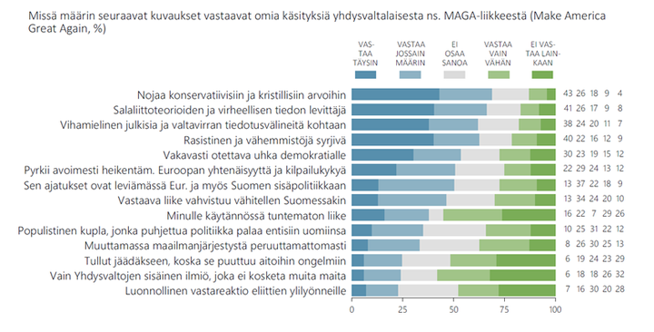 Myös Trumpia tukeva MAGA-liike jakaa suomalaisia. Neljäsosa (25 %) arvioi, että MAGA-liike on tullut jäädäkseen, koska se puuttuu aitoihin ongelmiin. Perussuomalaisten äänestäjistä näin ajattelee 66 prosenttia ja kokoomuksen äänestäjistä 35 prosenttia. Samalla enemmistö liittää MAGA-liikkeeseen vahvasti konservatiivisia ja kristillisiä arvoja sekä useita kielteisiä piirteitä.