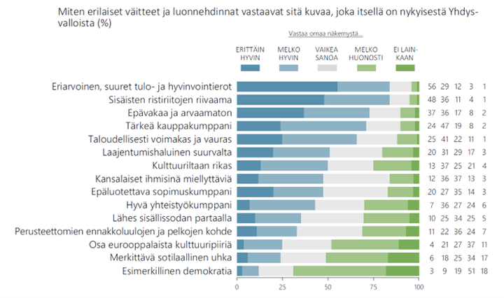 Suomalaisten Yhdysvaltoihin liittyvä ristiriita näkyy siinä, että samaan aikaan maa nähdään monin tavoin välttämättömänä kumppanina. Enemmistö (71 %) pitää Yhdysvaltoja tärkeänä kauppakumppanina. Reilu puolet (55 %) näkee, että maa on ongelmistaan huolimatta keskeinen länsimaisten arvojen puolustaja maailmassa sekä tärkeä kumppani Suomelle. Kuitenkin lähes puolet (47 %) arvioi, että Yhdysvallat on epäluotettava sopimuskumppani, mikä kertoo nopeasti kasvaneesta epäluuloisuudesta maan poliittista toimintakykyä ja sitoumusten pitävyyttä kohtaan.