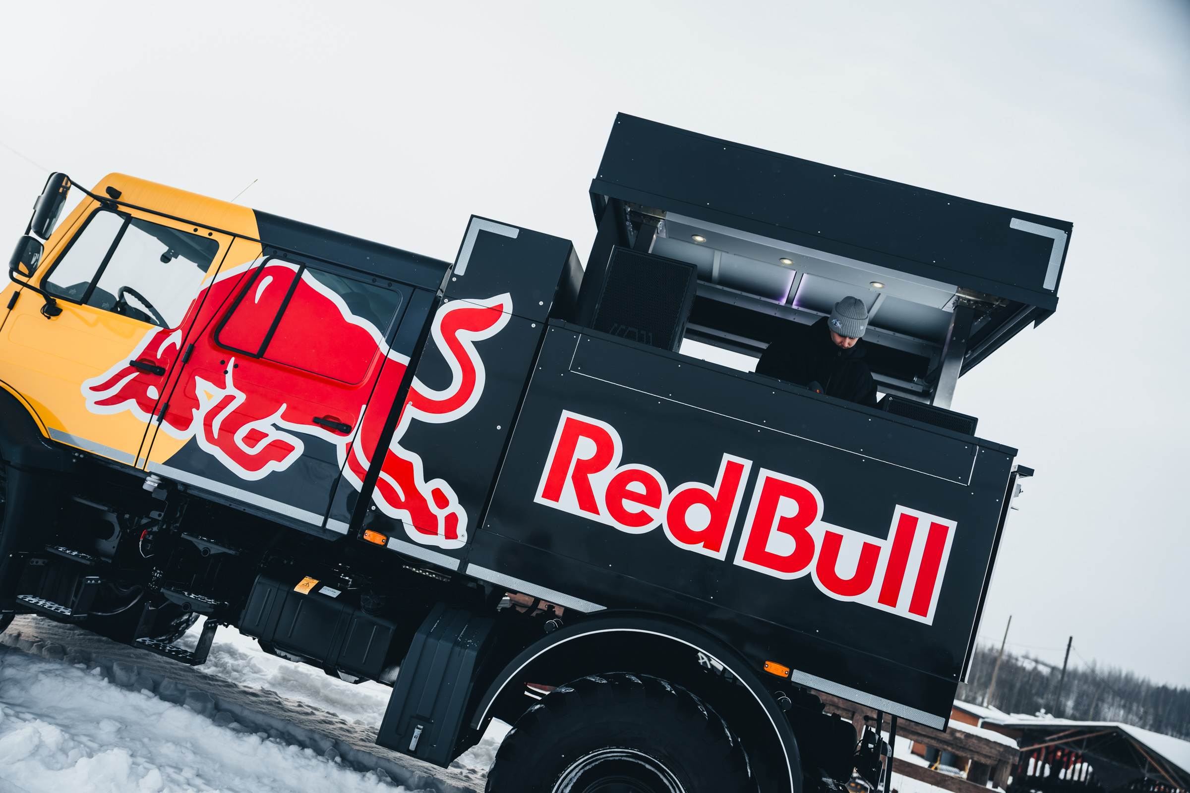 – Vajaa kaksi vuotta sitten Red Bull lähestyi, että on tarvetta lähteä uusimaan kalustoa ja aika avoimesti saimme tehdä ehdotuksia. Kahdeksasta autosta lähdettiin ja päädyttiin Unimogiin, johtuen sen massiivisuudesta, maskuliinisuudesta ja huomiota herättävästä ulkonäöstä. Konseptissa yhdistetään ravintolaboksi, äärimmäisen iso subwooferi ja Unimog, kertoo Autofabrikin Marko Edefelt.