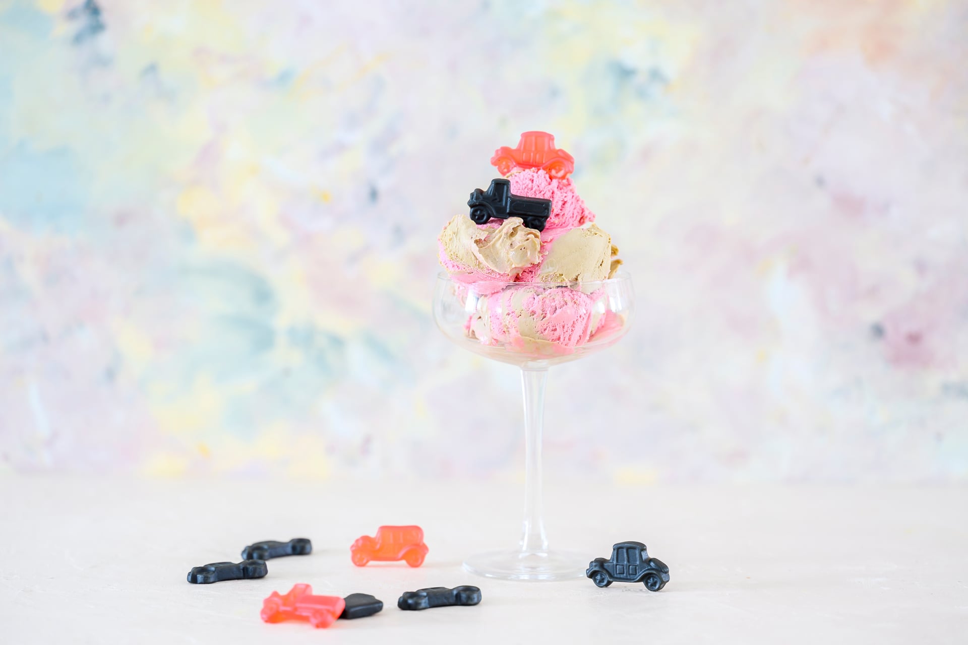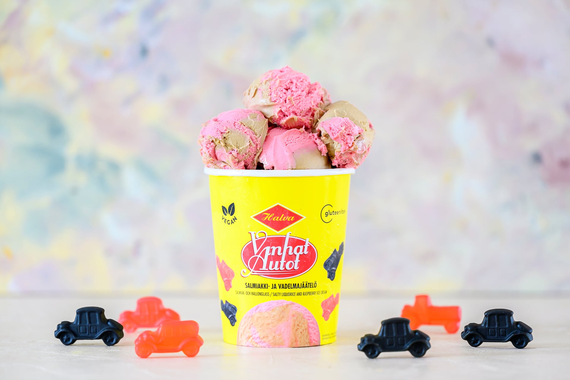 Vanhat Autot salmiakki- & vadelmajäätelö yhdistää tutun karkkipussin inspiroiman makumaailman: salmiakin voimakkaan intensiivisyyden ja aidon vadelman raikkaan marjaisuuden.