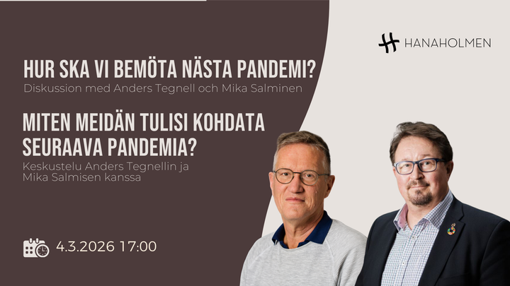 Den fjärde mars besöker Anders Tegnell Hanaholmen för att tillsammans med Mika Salminen, numera generaldirektör på Institutet för hälsa och välfärd, och HBL-journalisten Torsten Fagerholm samtala om sina erfarenheter från coronapandemin. Vad hände? Vad har vi lärt oss? Hur skall Sverige och Finland tillsammans bemöta och hantera nästa pandemi?