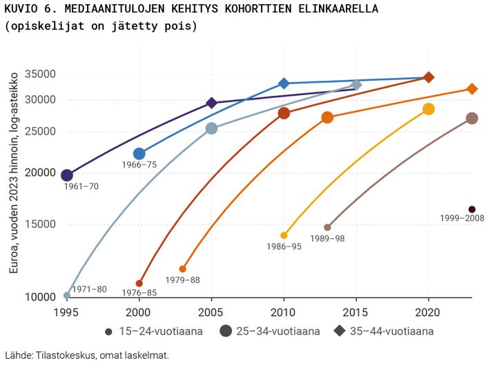 Tulot kasvavat voimakkaasti siirryttäessä 15–24-vuotiaiden ikäryhmästä työuran alkuvaiheeseen. Lisäksi nykyisten 15–24-vuotiaiden tulotaso on kyseisessä ikävaiheessa korkeampi kuin aiemmilla sukupolvilla vastaavassa iässä.