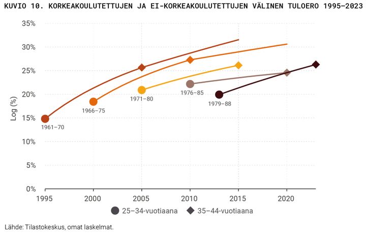 Analyysi osoittaa, että korkeakoulutettujen tulot ovat selvästi korkeammat jo työuran alussa. Tuloero kasvaa uran edetessä, eikä korkeasti ja matalammin koulutettujen välinen kuilu ole kaventunut.