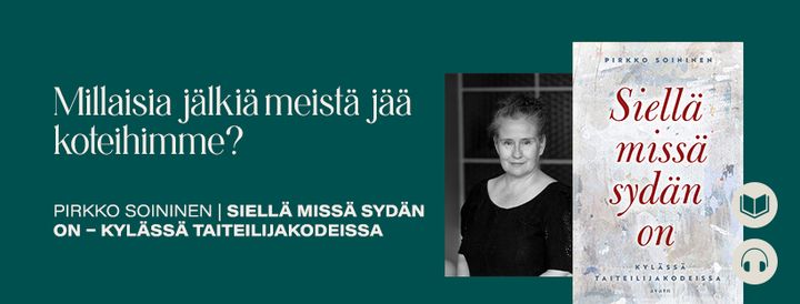 Millaisia ovat luovien ihmisten tilat, joissa taide syntyy? Pirkko Soininen kirjoitti Siellä missä sydän on -teoksen kodeista ja niissä asuneista taiteilijoista. Soininen kertoo tilaisuudessa tuosta löytöretkestä ja lumoavasta matkasta museoiksi muutettuihin taiteilijakoteihin.