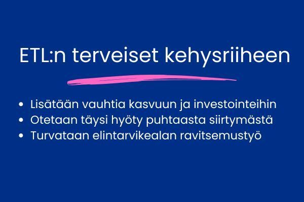 Elintarviketeollisuusliitto (ETL) esittää huhtikuun kehysriiheen kolmea konkreettista painopistettä: lisätään vauhtia kasvuun ja investointeihin, otetaan täysi hyöty puhtaasta siirtymästä ja turvataan elintarvikealan ravitsemustyö.