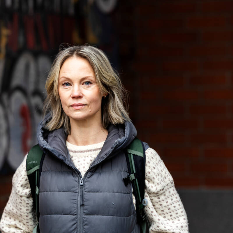 Kuvassa on ulkovaatteisiin pukeutunut nainen, joka katsoo suoraan kameraan vakava ilme kasvoillaan.