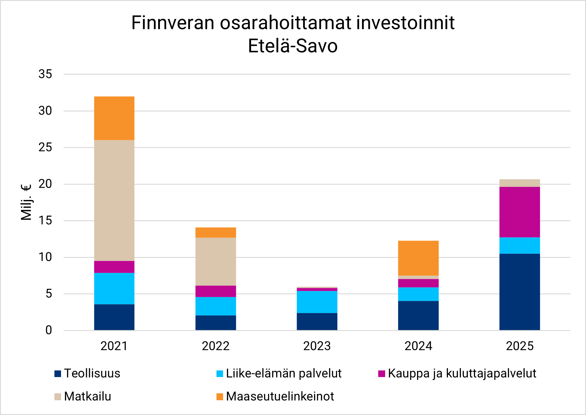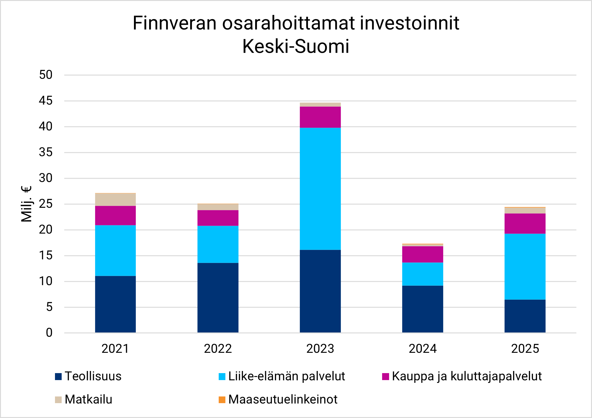 Keski-Suomen yrityksille myönnettiin vuonna 2025 rahoitusta yhteensä noin 32 miljoonaa euroa (32). Suurimmat rahoituksen saajat olivat teollisuus sekä liike-elämän palvelut.