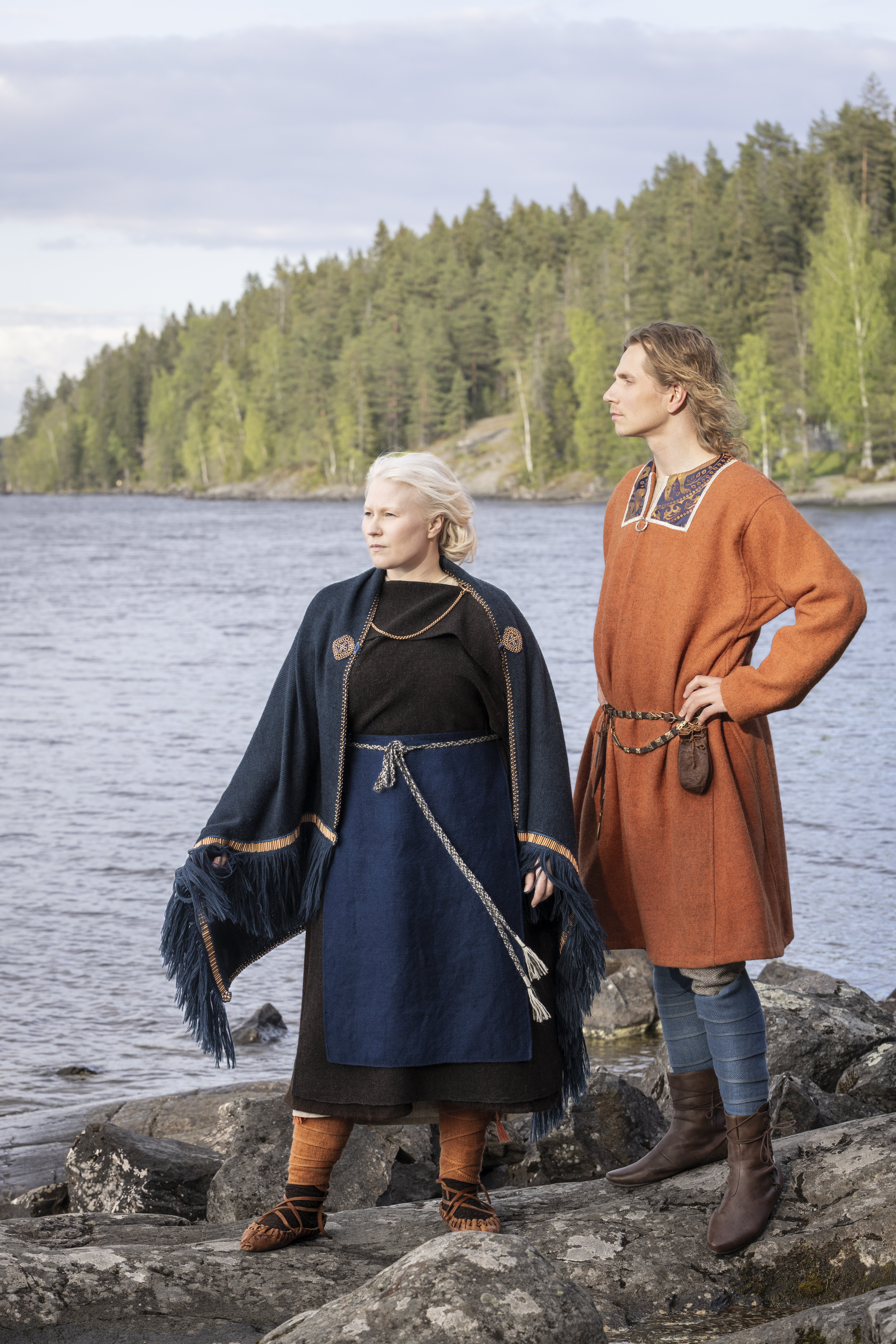 Vapriikin uusi julkaisu Muinaispuvuista silkkimyssyihin – Arkeologista tekstiilitutkimusta Pirkanmaalta, sisältää Tampereen uusien muinaispukujen teko-ohjeet. Vapriikissa voi tutustua muinaispukuihin lauantaina muun muassa muotinäytöksessä. Kuvassa uusia pukuja esittelevät Noora Louhimo ja Jaro Väisänen. Saarni Säilynoja/Vapriikin kuva-arkisto