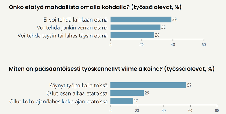 Työssä olevista 61 prosenttia tekee ainakin jonkin verran etätöitä. Vähintään kerran viikossa etätyötä tekee 44 prosenttia työssäkäyvistä, mutta pääosin työpaikalla työskentely on edelleen yleisin työnteon muoto.