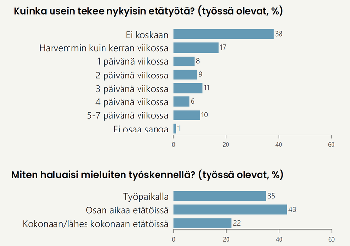 Työntekijöiden toiveissa korostuu hybridityö: 43 prosenttia haluaisi työskennellä mieluiten osan aikaa etänä, kun taas 22 prosenttia toivoisi voivansa tehdä työnsä kokonaan tai lähes kokonaan etänä. Kolmasosa (35 %) haluaa mieluiten työskennellä työpaikalla.
