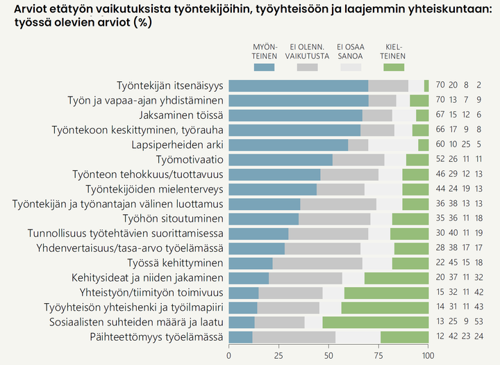 Suomalaiset arvioivat etätyön myönteisimmät vaikutukset liittyvän työntekijän itsenäisyyteen, työn ja vapaa-ajan yhteensovittamiseen, jaksamiseen sekä työntekoon keskittymiseen. Seitsemän kymmenestä (70 %) arvioi etätyön tukevan itsenäisyyttä ja työn ja muun elämän yhteensovittamista. Myös jaksamisen ja työrauhan kannalta vaikutukset nähdään selvästi useammin myönteisinä kuin kielteisinä.