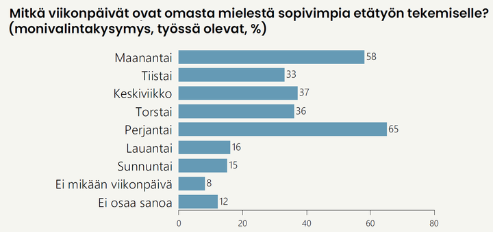 Työssä olevien mielestä sopivimpia etätyöpäiviä ovat perjantai ja maanantai. Perjantain valitsee sopivaksi etätyöpäiväksi 65 prosenttia ja maanantain 58 prosenttia. Tämä kertoo siitä, että etätyö rytmittyy vahvasti työviikon reunoille.