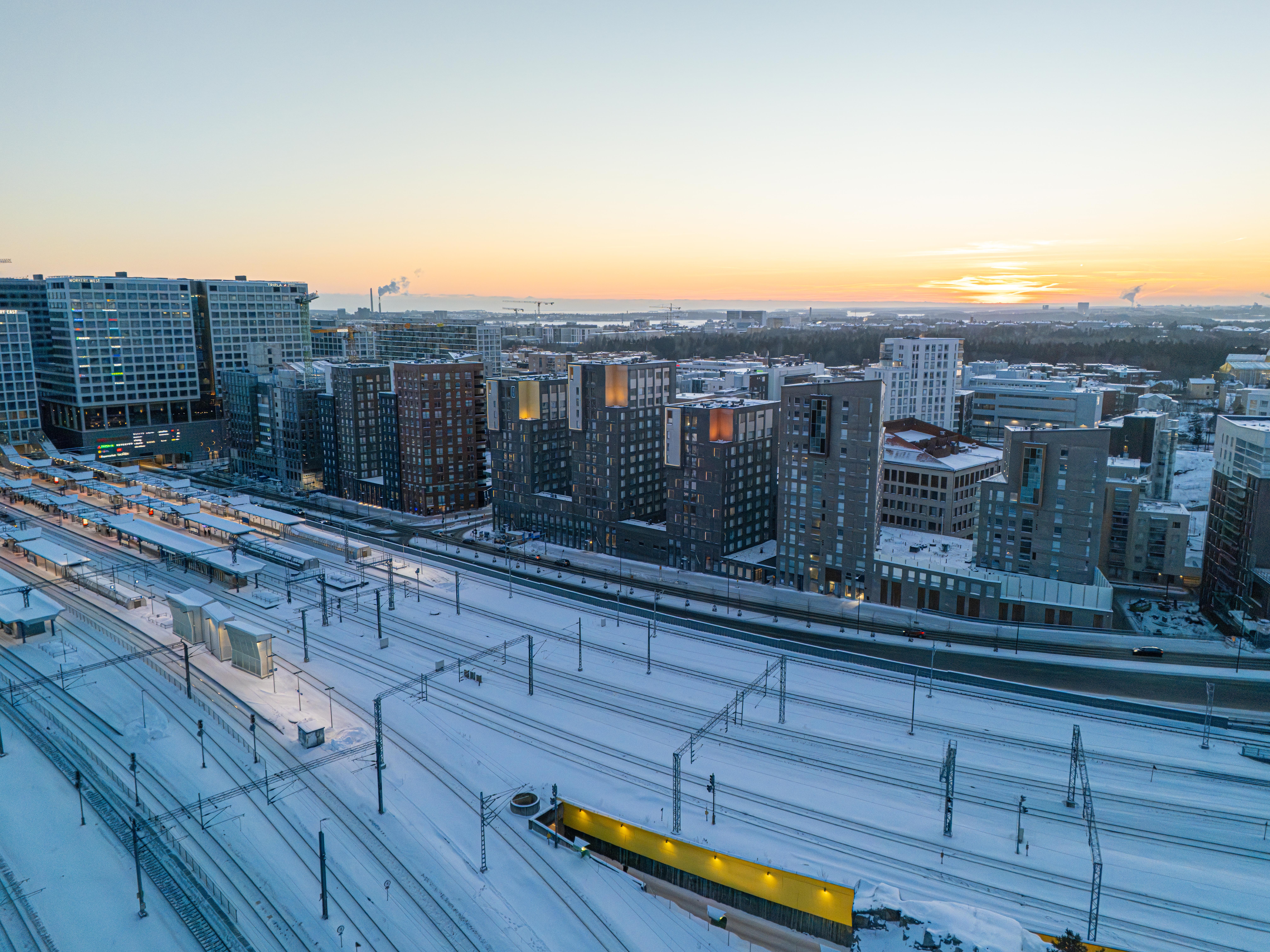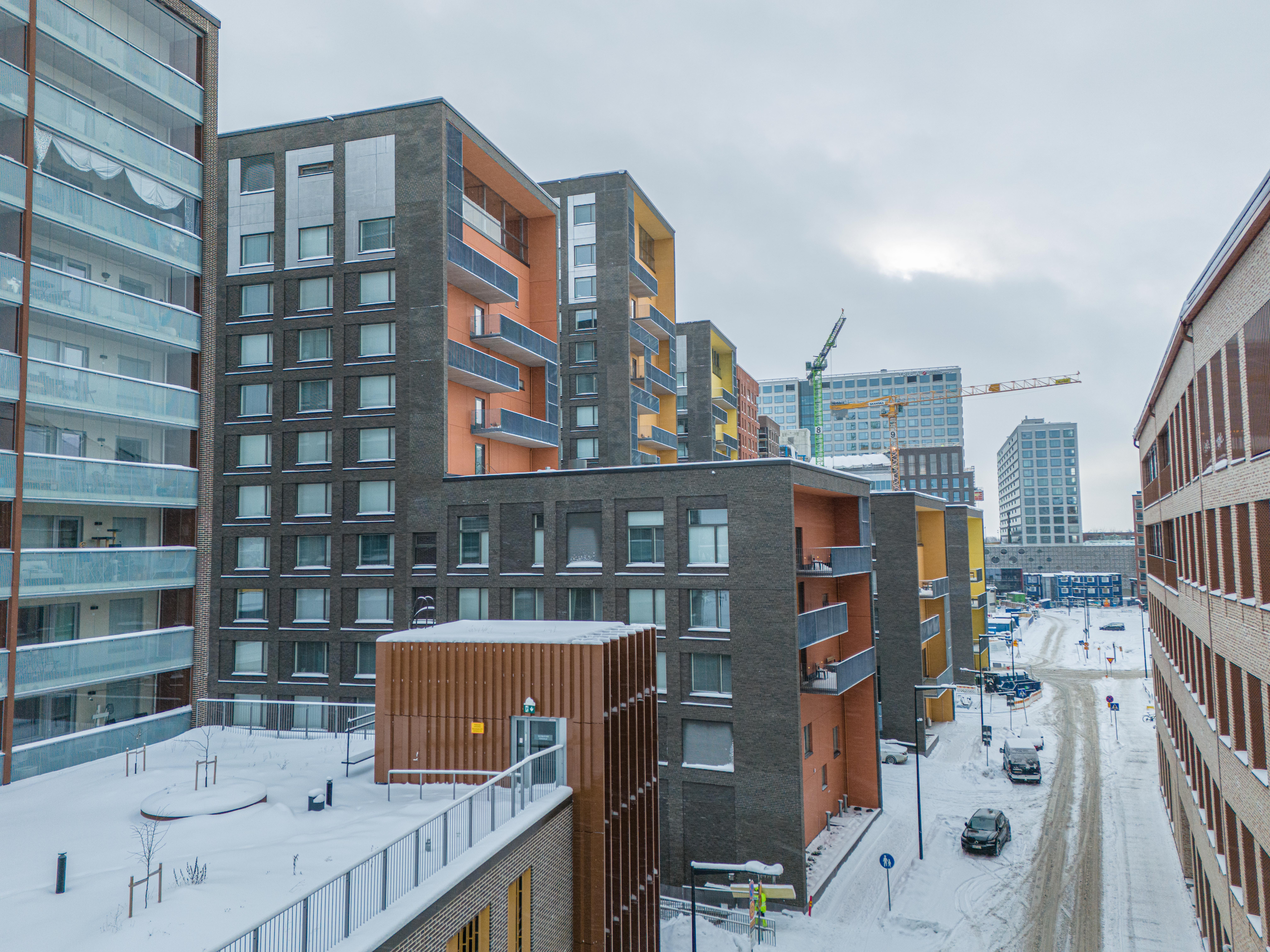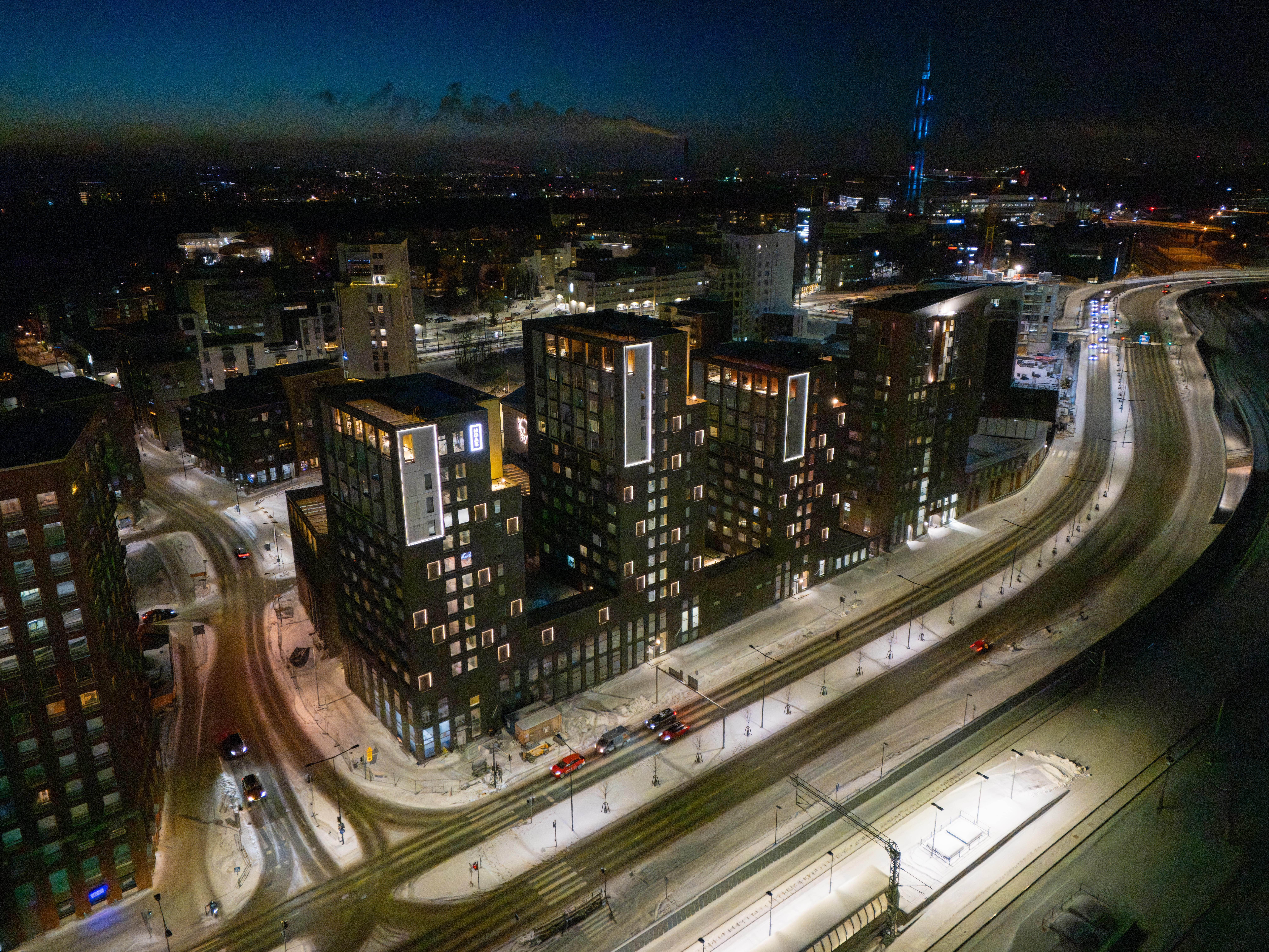 – Melumallinnuksilla varmistettiin melunsuojaamisen näkökulmasta paras massoittelu. Käytännössä koko kortteli on suunnitteluratkaisu itsessään. Torni- ja lamellitalojen sijoittelu ja mittasuhteet on suunniteltu sellaisiksi, että massat suojaavat piha- ja oleskelualueita raide- ja katumelulta, arkkitehti, pääsuunnittelija J-P Lehtinen ONE Architectsista kertoo.