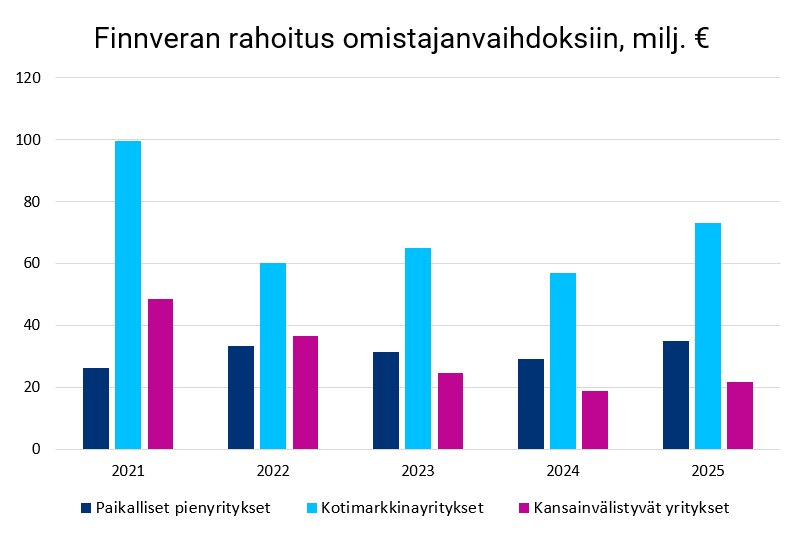 Yritysten omistajanvaihdosten rahoitus kääntyi odotettuun kasvuun. Finnvera myönsi rahoitusta omistajanvaihdoksiin vuonna 2025 yhteensä 130 miljoonaa euroa, mikä on lähes neljänneksen enemmän kuin edellisvuonna. Yrityskauppojen määrät nousivat eri kokoluokan yrityksissä ja myös rahoitettujen kauppojen keskikoko kasvoi. Teollisuuden yrityskaupoissa nähtiin merkittävä käänne parempaan.