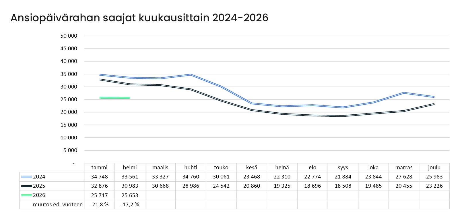 A-kassasta sai ansiopäivärahaa helmikuussa 25 653 jäsentä, mikä on 17,2 prosenttia vähemmän kuin vuotta aiemmin. Edelliseen kuukauteen verrattuna saajien määrä pysyi lähes ennallaan, laskua oli vain 0,2 prosenttia.