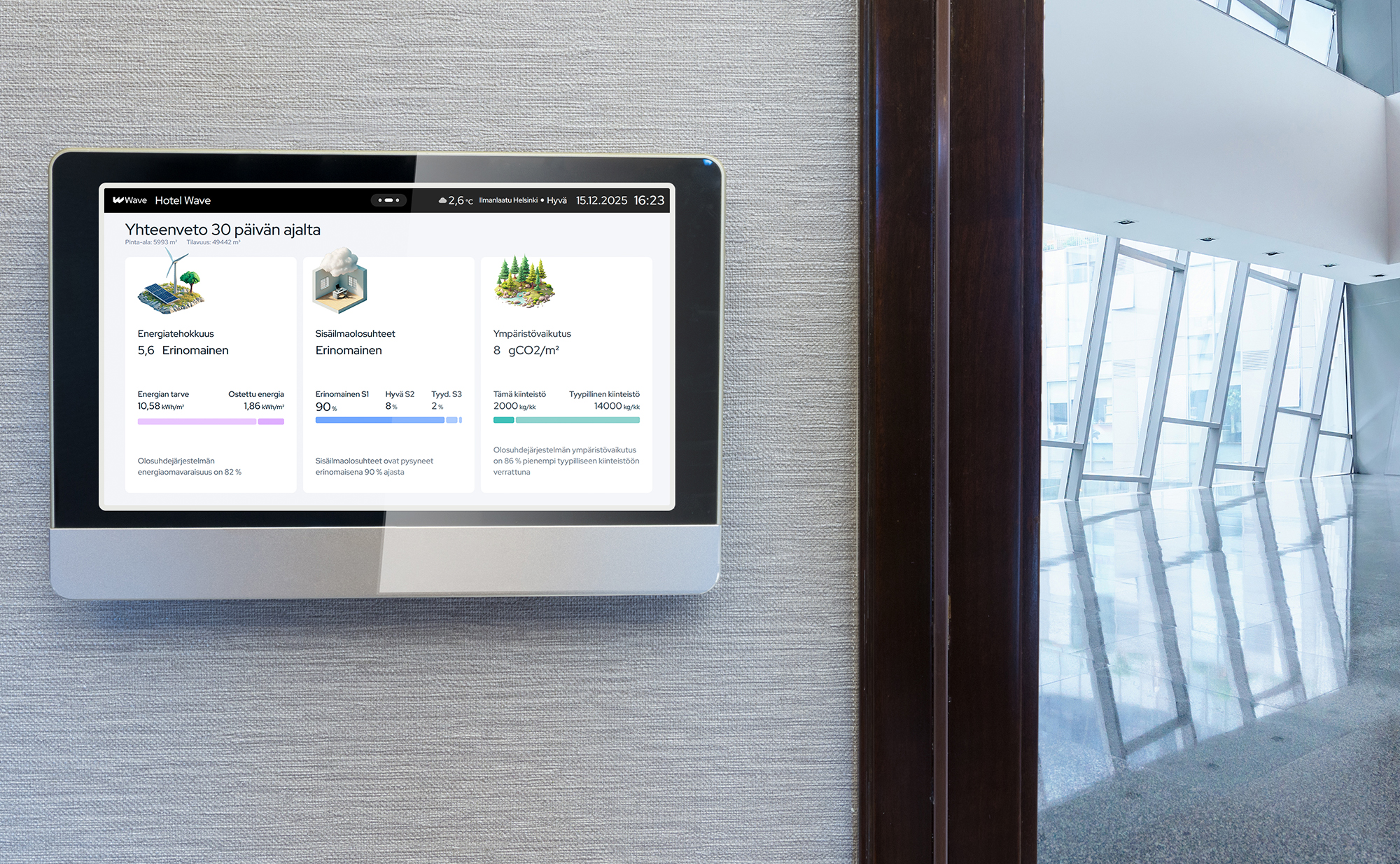 Wave-järjestelmä hyödyntää paitsi kiinteistön laitteista kerättyä myös ulkoista dataa, kuten sääennusteita. Lopputuloksena on malli, jolla pystytään ennakoimaan muuttuvia tilanteita ja pitämään kiinteistön sisäolosuhteet tavoitearvoissaan energiatehokkaasti.