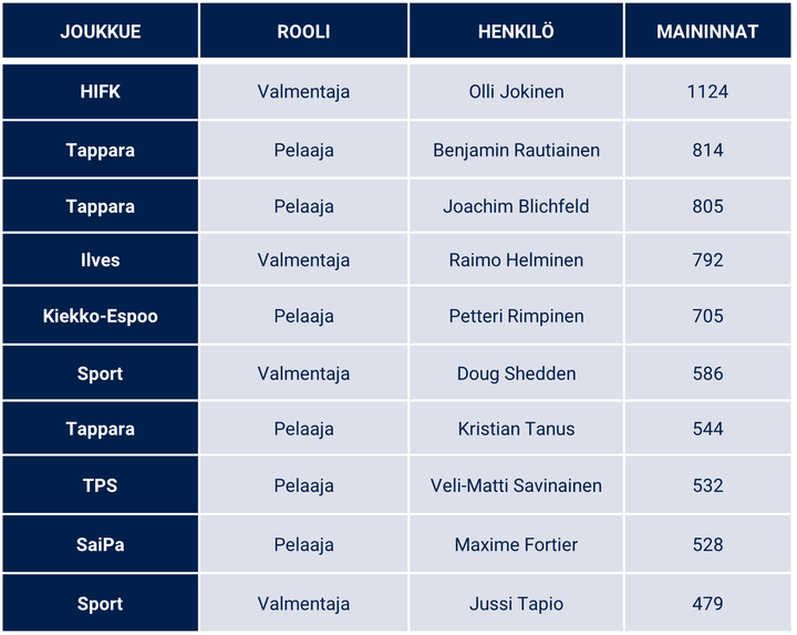 Vaikka joukkueiden medianäkyvyys ei juurikaan heijastele sarjapisteitä, pelaajien kohdalla hyvä suoriutuminen näkyy selvästi mediahuomiossa. Pelaajista eniten mediamainintoja saivat Tapparan supertähdet Benjamin Rautiainen ja Joachim Blichfeld. Kaksikko on ollut hurjassa vireessä koko kauden ja Rautiainen teki seurahistoriaa rikkomalla Tapparan yhden kauden piste-ennätyksen.