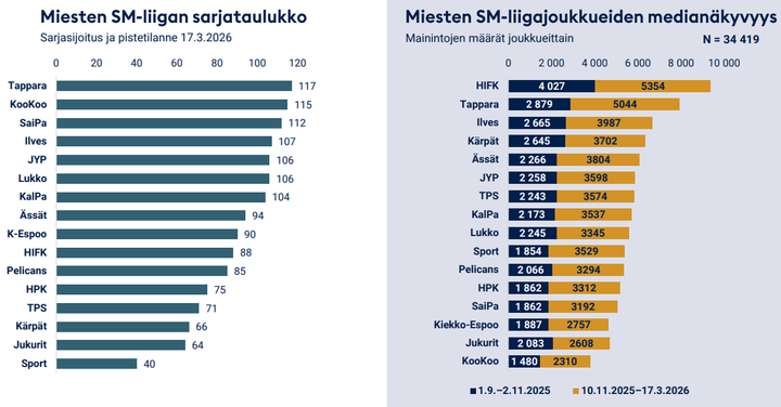 SM-liigajoukkueiden medianäkyvyys ennen kevään pudotuspelejä ja historiallista sarjauudistusta kertoo joukkuebudjetin ja pelaajatarinoiden merkityksestä. Mediaseuranta- ja analyysitoimisto Retrieverin julkaisemasta SM-liigan medianäkyvyysbarometrista käy ilmi, että hyvä suoriutuminen kasvattaa yksittäisten pelaajien saamaa mediahuomiota, mutta joukkueiden näkyvyyttä selittävät muut tekijät kuin sijoitus sarjataulukossa.