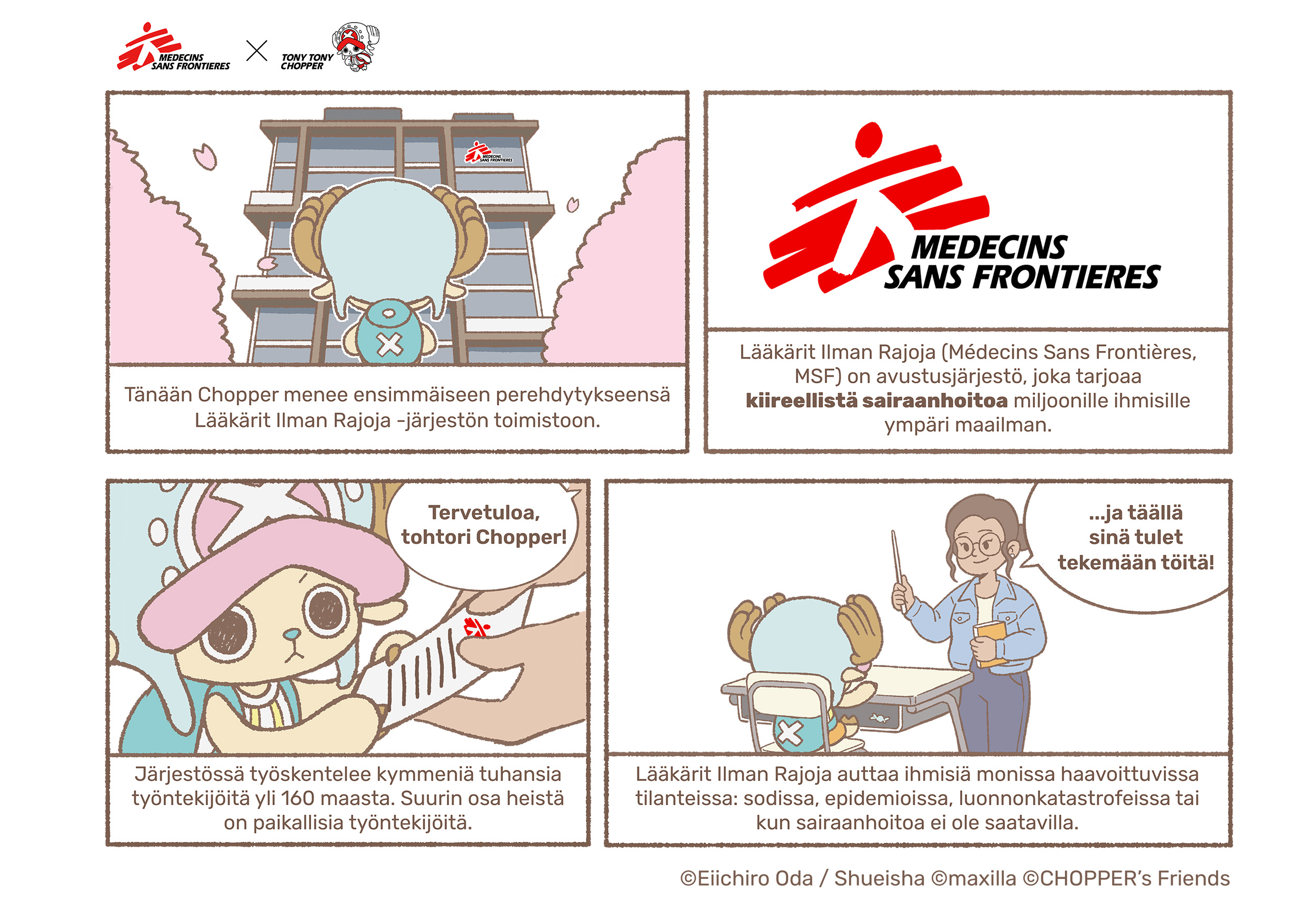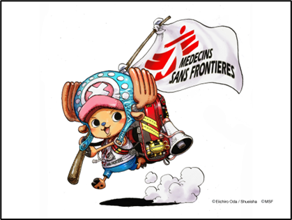 Tony Tony Chopper, rakastettu hahmo Eiichiro Odan luomasta ja Shueishan julkaisemasta ”ONE PIECE” -mangasarjasta, on nimetty Lääkärit Ilman Rajoja -järjestön (Médecins Sans Frontières, MSF) viralliseksi tukijaksi. Tarkoituksena on lisätä tietoisuutta järjestön maailmanlaajuisesta sairaanhoitoon keskittyvästä avustustoiminnasta.