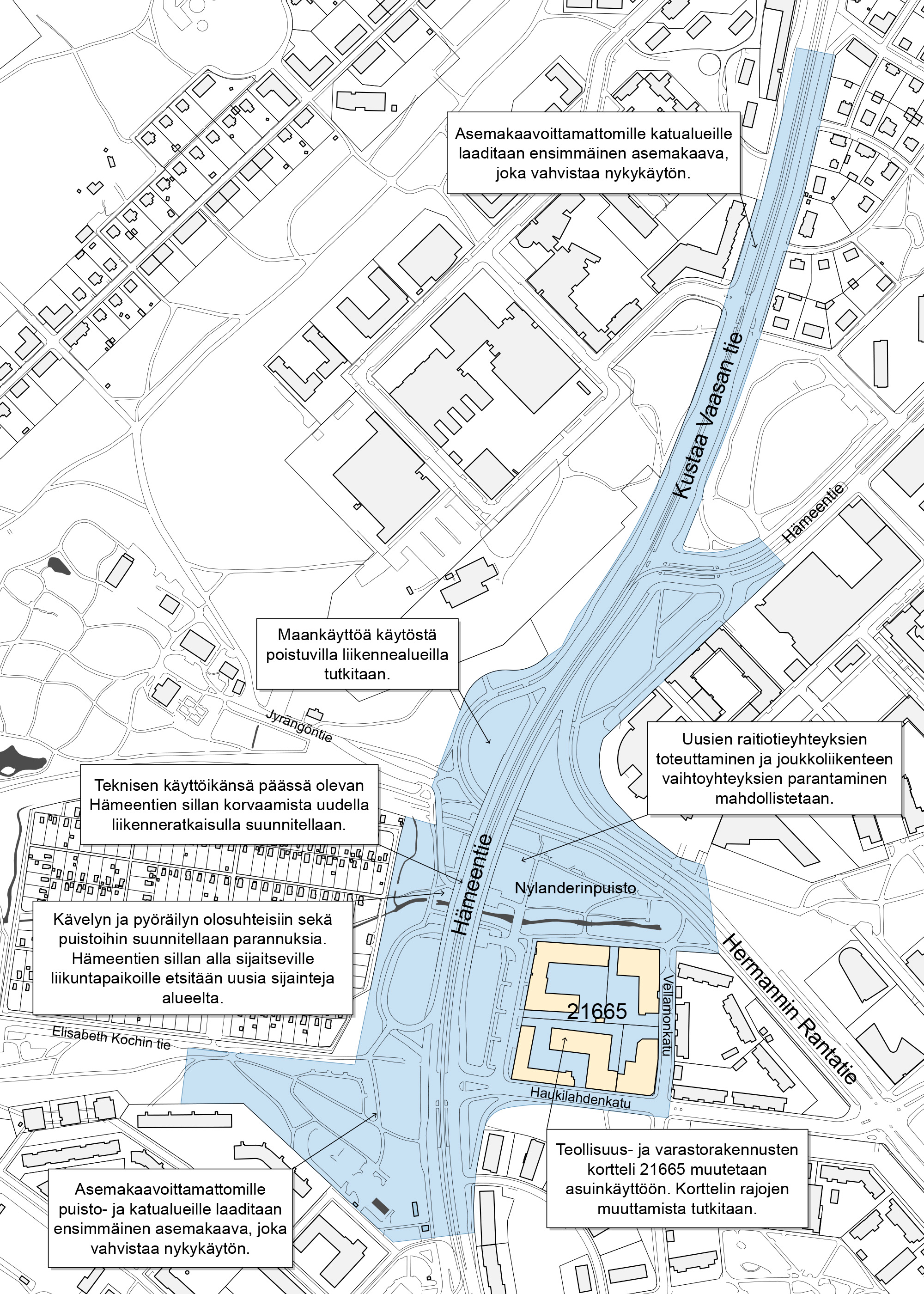 Hämeentien, Hermannin rantatien ja Kustaa Vaasan tien liittymäalueella käynnistyy asemakaavan muutos. Hämeentullin suunnitelma mahdollistaa Viikin-Malmin raitiotien toteuttamisen ja parantaa pyöräilyn ja kävelyn olosuhteita. Samalla selvitetään suunnittelualueella sijaitsevan korttelin muuttamista asuinkäyttöön.