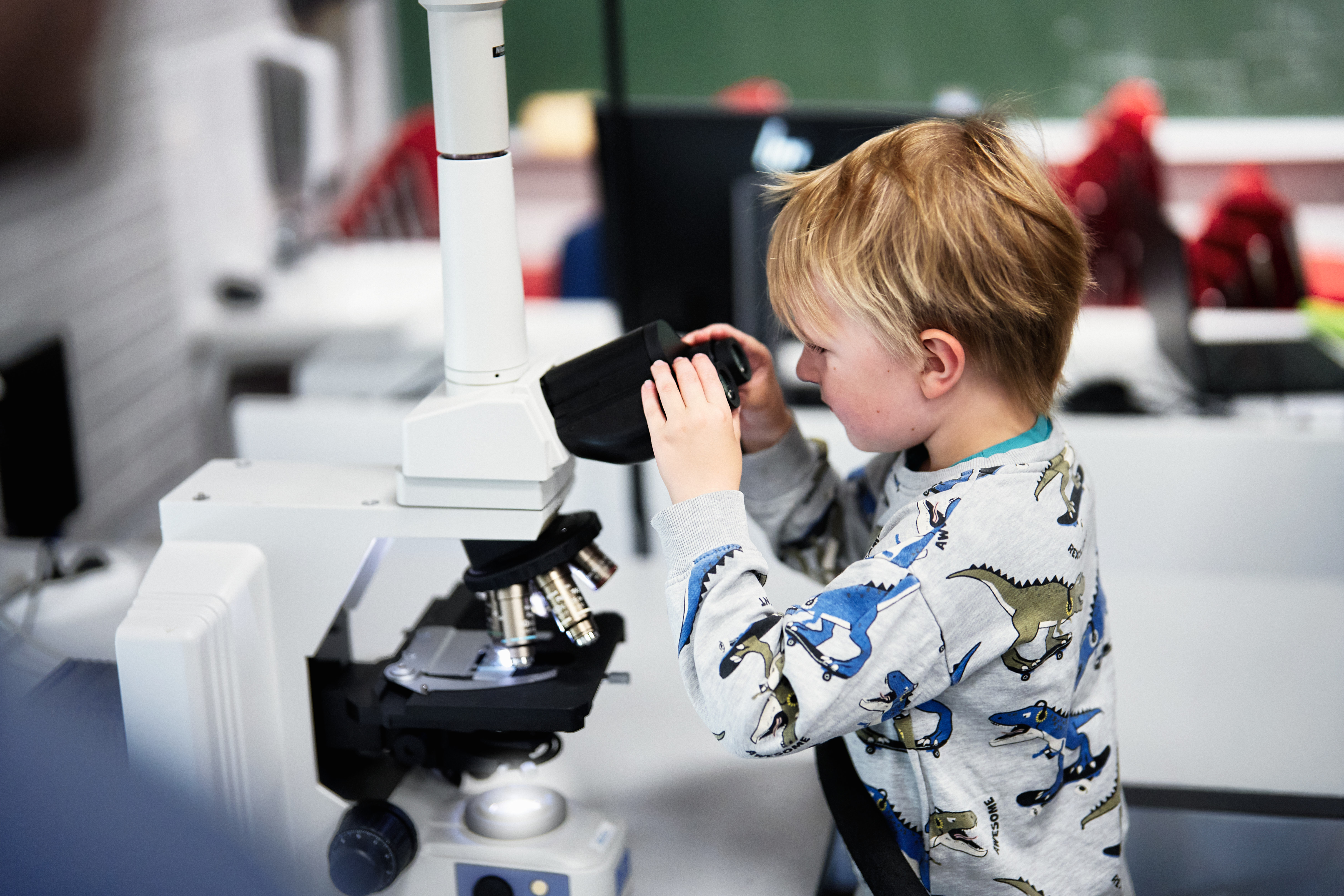 Pieni poika katsoo mikroskooppiin luokkahuoneessa.