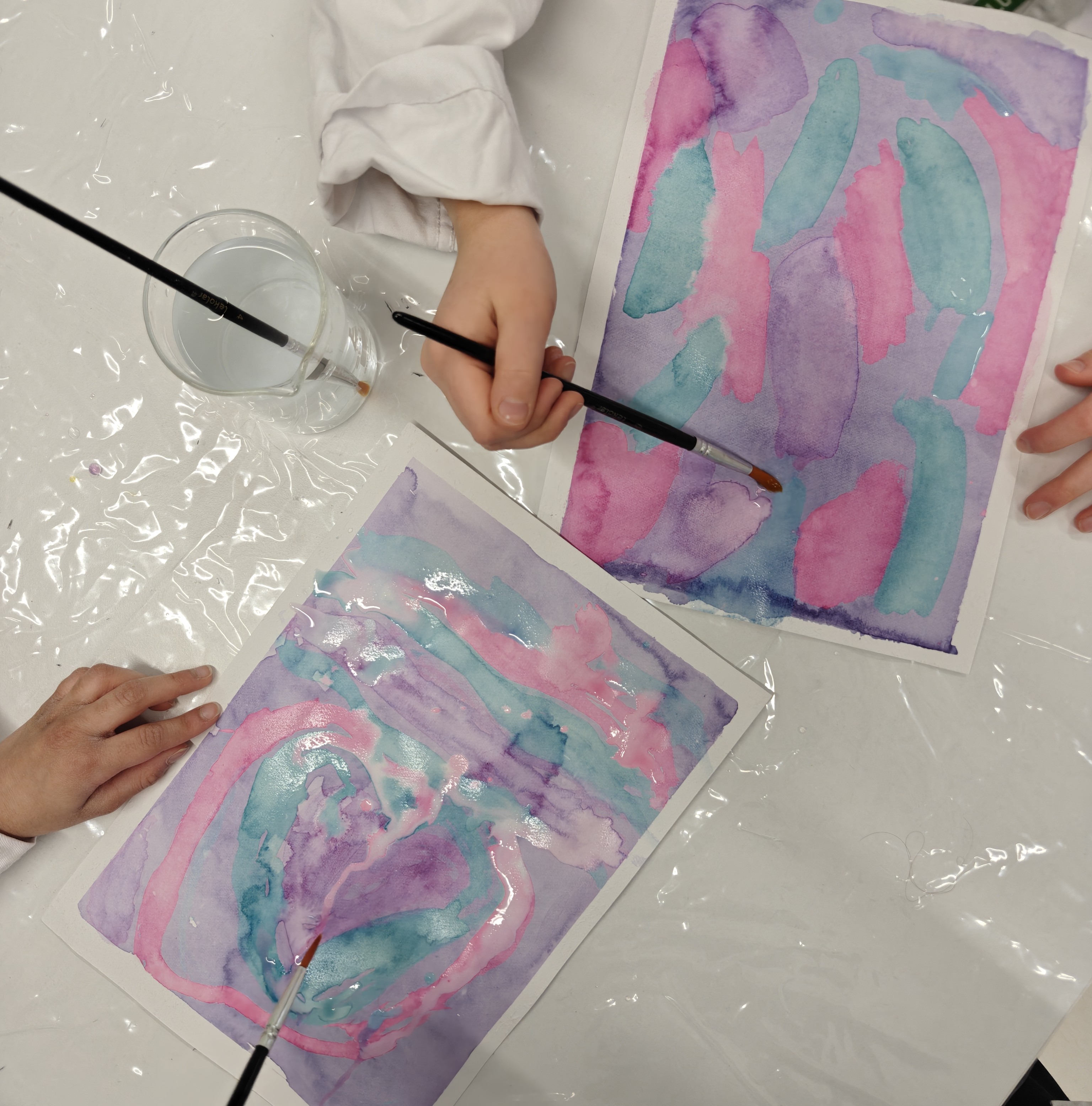 Kaksi henkilöä maalaa vesiväreillä abstrakteja kuvia.
