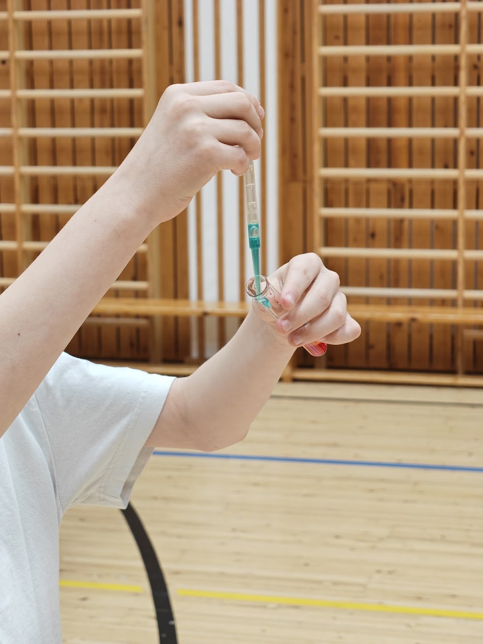Lapsi pitää käsissään pipettiä laboratoriotilassa.
