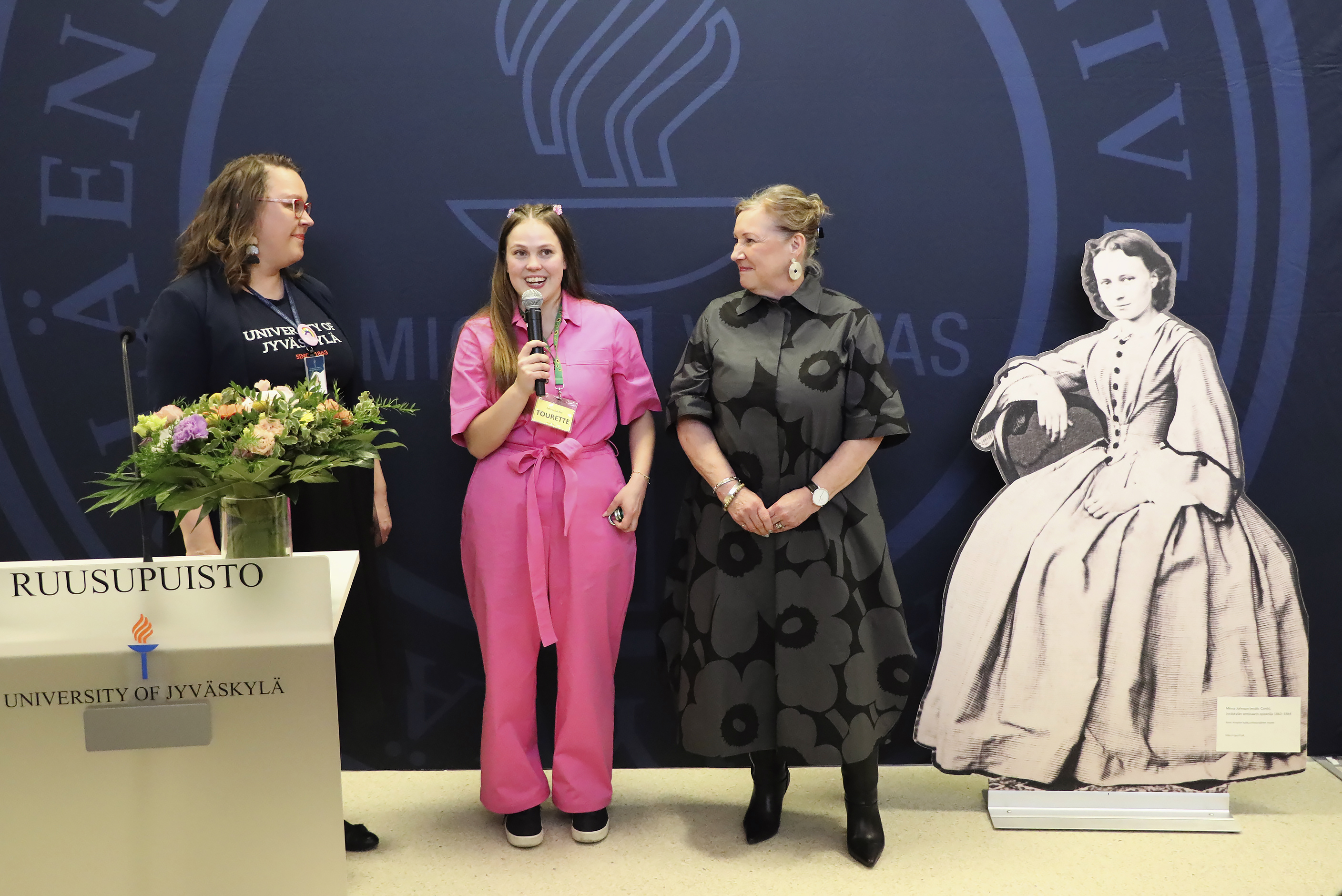 Räikkönen vastaanotti Jyväskylän yliopiston opettajankoulutuslaitoksen myöntämän tasa-arvotunnustuksen. Kuvassa projektipäällikkö Anna Roikonen (JYU), Katariina Räikkönen sekä opettajankoulutuslaitoksen johtaja Sirpa Eskelä-Haapanen.