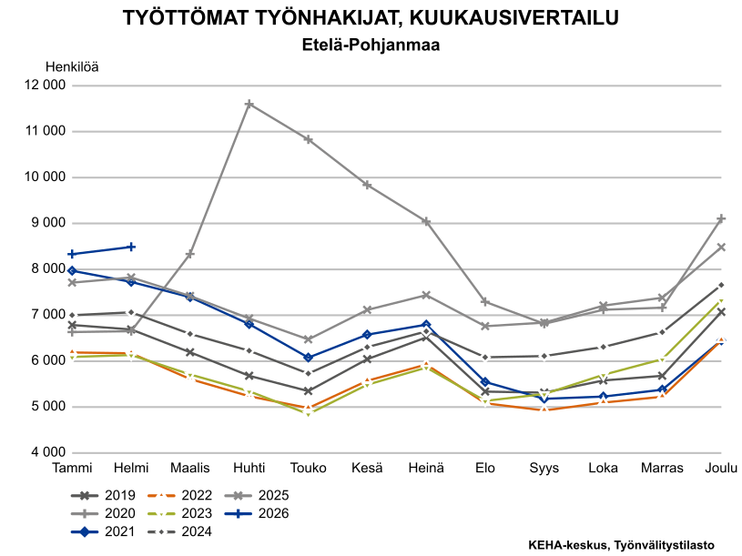 Etelä-Pohjanmaan työttömien työnhakijoiden kuukausivertailu vuosien 2019-2026 aikana.
