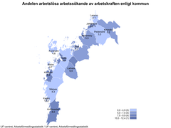 Antalet arbetslösa arbetssökande ökade i två av tre ekonomiska regioner i landskapet Österbotten jämfört med året innan. Antalet arbetslösa ökade i Vasaregionen med 494 personer (+ 12 %) och i Sydösterbotten med 26 personer (+ 6 %). Arbetslösheten minskade i Jakobstadsregionen med 13 personer (- 1 %). Av Österbottens ekonomiska regioner var arbetslöshetsgraden lägst i Jakobstadsregionen, 6,0 %