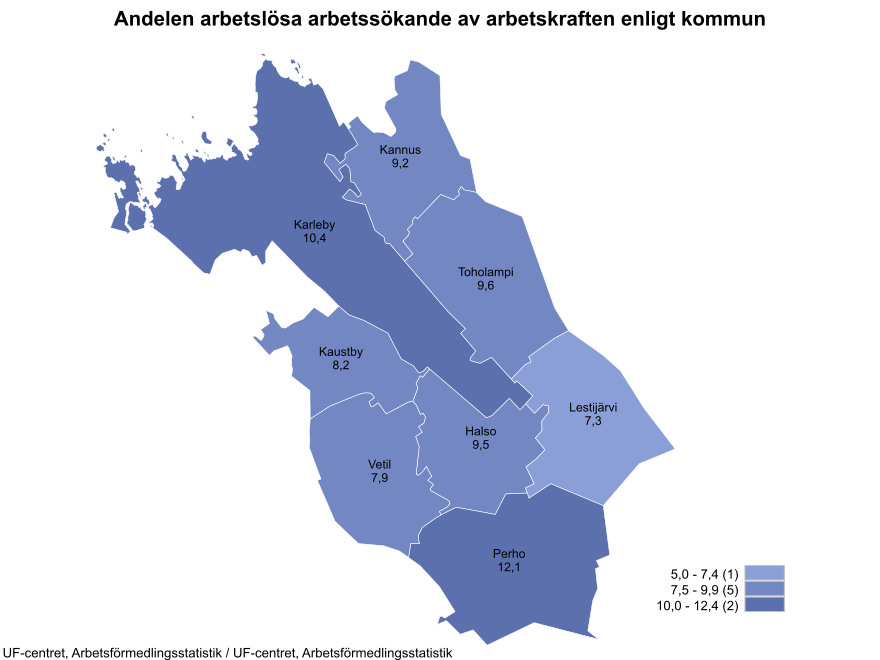 Inom området för livskraftscentralen i Österbotten (Österbotten, Mellersta Österbotten) fanns det i slutet av februari sammanlagt 9 489 arbetslösa arbetssökande: i landskapet Österbotten sammanlagt 6 378 arbetslösa arbetssökande och i landskapet Mellersta Österbotten sammanlagt 3 111 arbetslösa arbetssökande. I Österbotten fanns det 507 fler arbetslösa arbetssökande än för ett år sedan. I Mellersta Österbotten var antalet arbetslösa arbetssökande 193 fler än för ett år sedan. Österbotten har den lägsta arbetslöshetsgraden i Fastlandsfinland, 7,4 % och Mellersta Österbotten har en arbetslöshetsgrad på 10,1 %. Uppgifterna framgår av UF-centrets Arbetsförmedlingsstatistik.