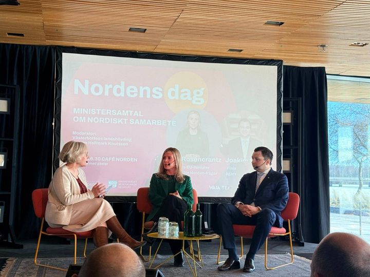 Eurooppa- ja omistajaohjausministeri Joakim Strand vieraili tänään Uumajassa Pohjolan päivänä, jota vietetään vuosittain 23. maaliskuuta. Ohjelmassa oli muun muassa tapaaminen Ruotsin EU‑ministeri Jessica Rosencrantzin kanssa sekä ministerien yhteinen paneelikeskustelu pohjoismaisen yhteistyön merkityksestä ja tulevaisuudesta vallitsevan epävakaan maailmantilanteen valossa.