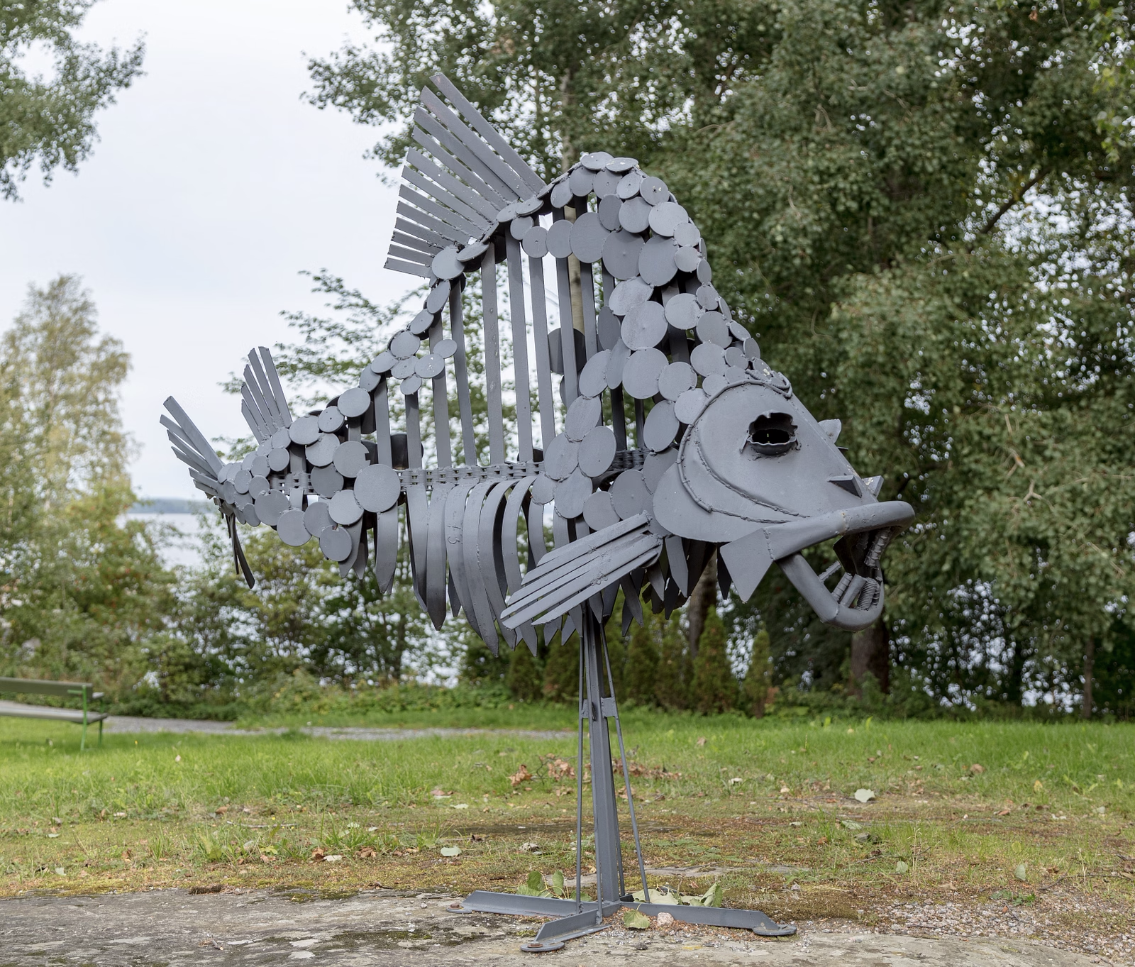 Metallinen kalaa esittävä veistos seisoo nurmikolla.