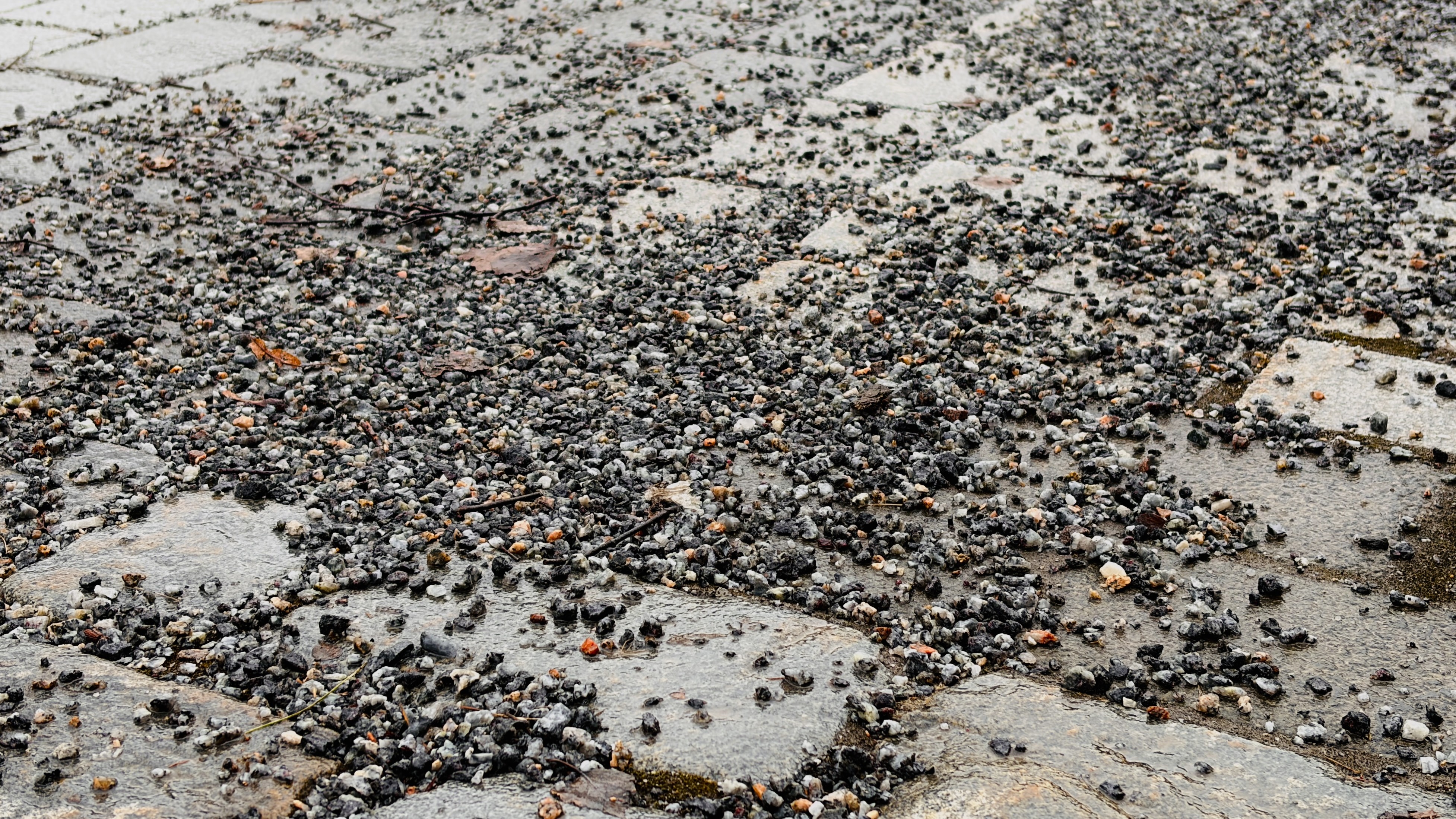 Gatstenar täckta med grus.