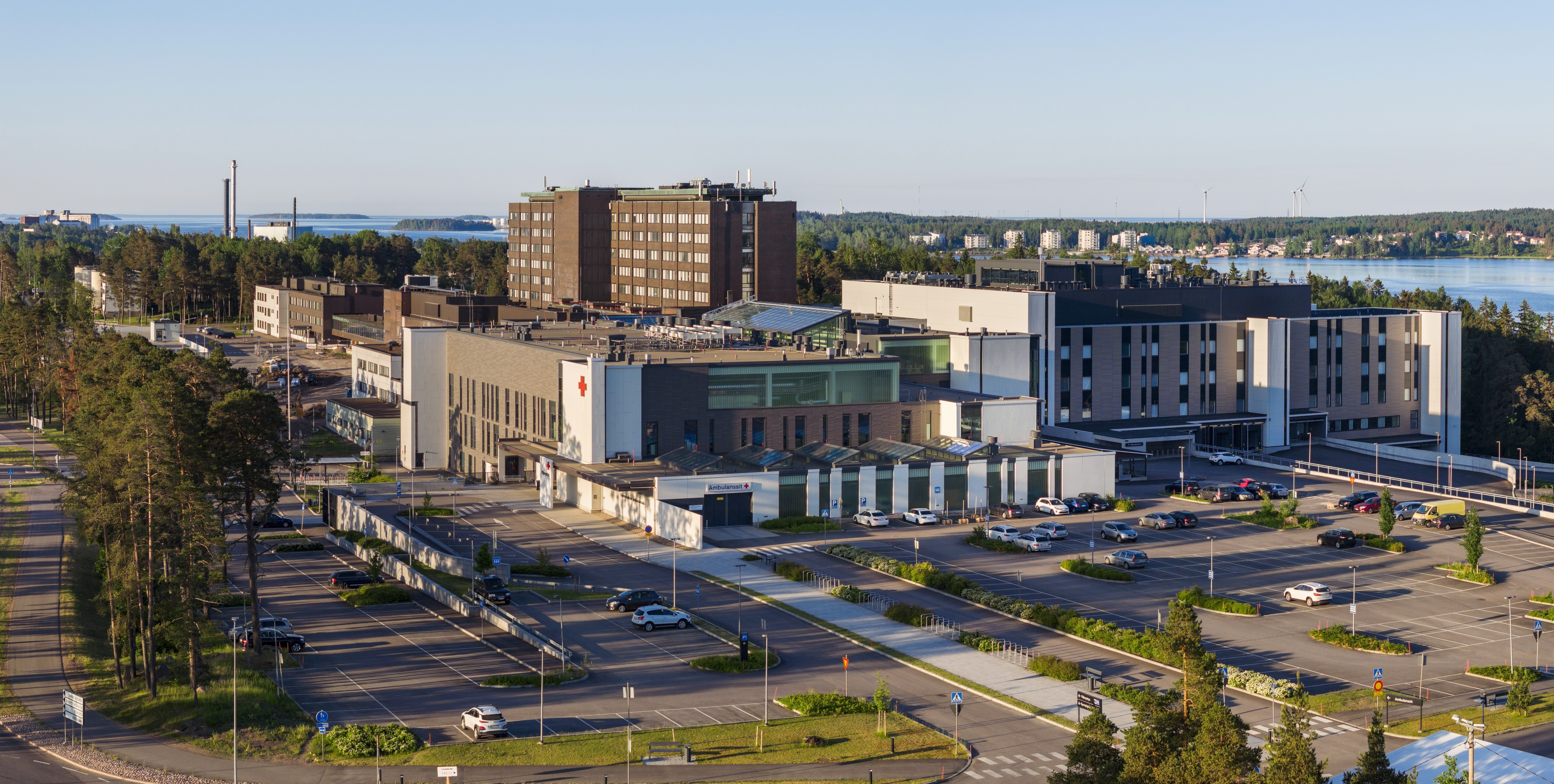 Ilmakuva Kymenlaakson keskussairaalasta vehreässä ympäristössä, taustalla järvimaisema.