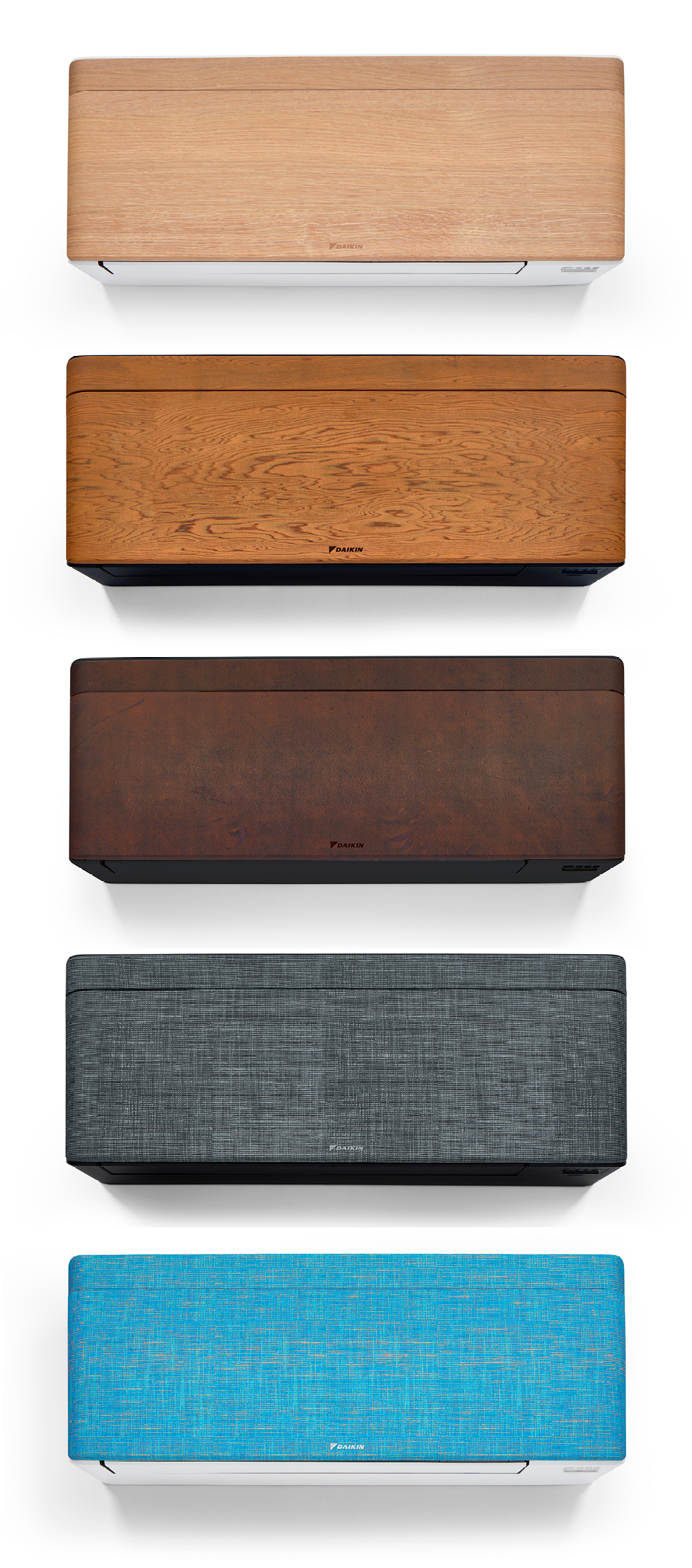 Design-vaihtoehdot tuovat sisäyksikköön puun, nahan ja tekstiilipinnan ilmettä. Pinnat on suunniteltu muistuttamaan luonnonmateriaaleja, kuten vaaleaa tai tummaa puuta, tummanruskeaa nahkaa ja harmaata tai värikästä kangasta. Ne ovat helposti puhdistettavia sekä kestäviä. Vaihtoehdot täydentävät nykyisiä valkoisia ja mustia Stylish-malleja ja antavat mahdollisuuden valita entistä paremmin kodin tyyliin sopivan laitteen.