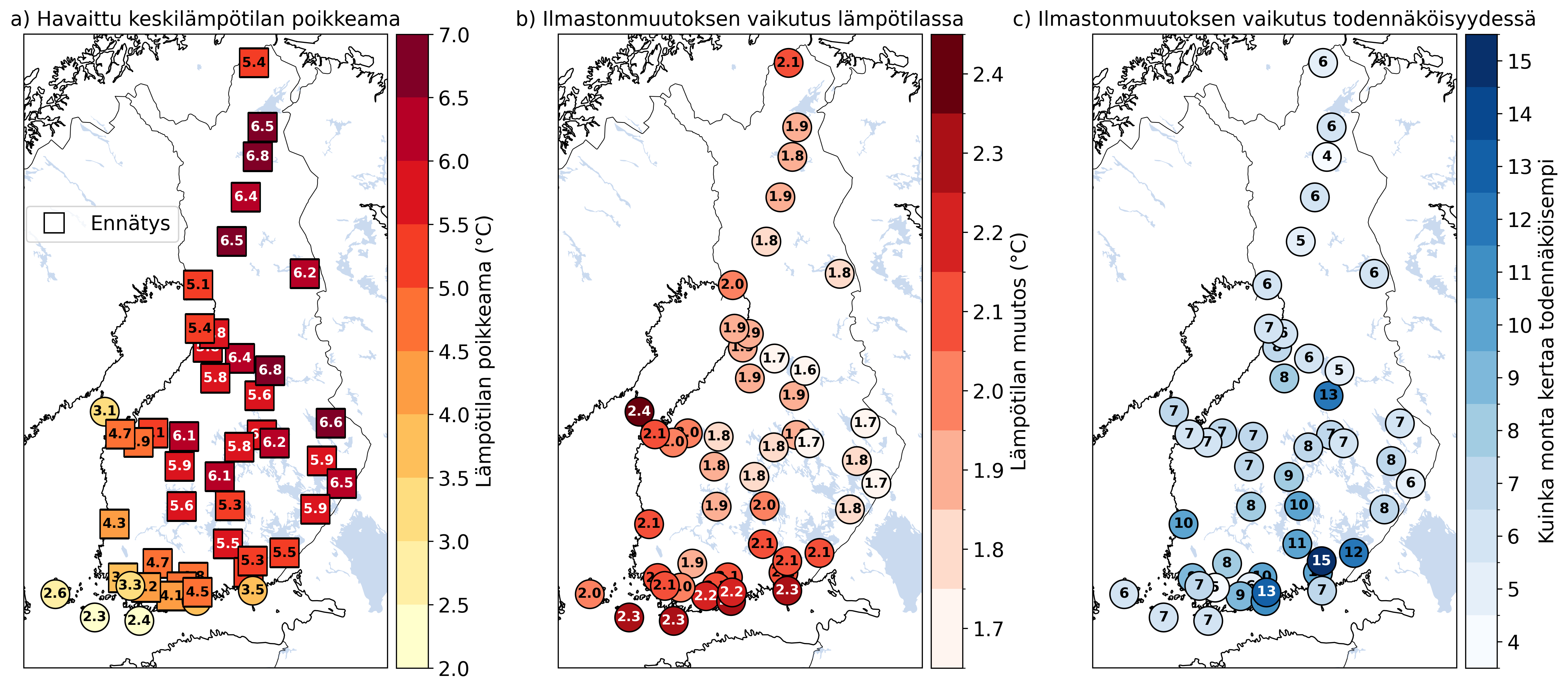 Kuva 1. a) Havaittu maaliskuun keskilämpötilan poikkeama vuosien 1991–2020 keskiarvosta. Asemat, joilla tehtiin uusi keskilämpötilan ennätys, on merkattu neliöllä. 1900-luvun alun jälkeisen ilmastonmuutoksen arvioitu vaikutus maaliskuun 2026 b) keskilämpötilaan ja c) esiintymistodennäköisyyteen. Kuvassa b) esitetään, kuinka monta astetta ilmastonmuutos nosti maaliskuun keskilämpötilaa, ja kuvassa c) kuinka monta kertaa todennäköisemmäksi ilmastonmuutos teki kyseisen keskilämpötilan.
