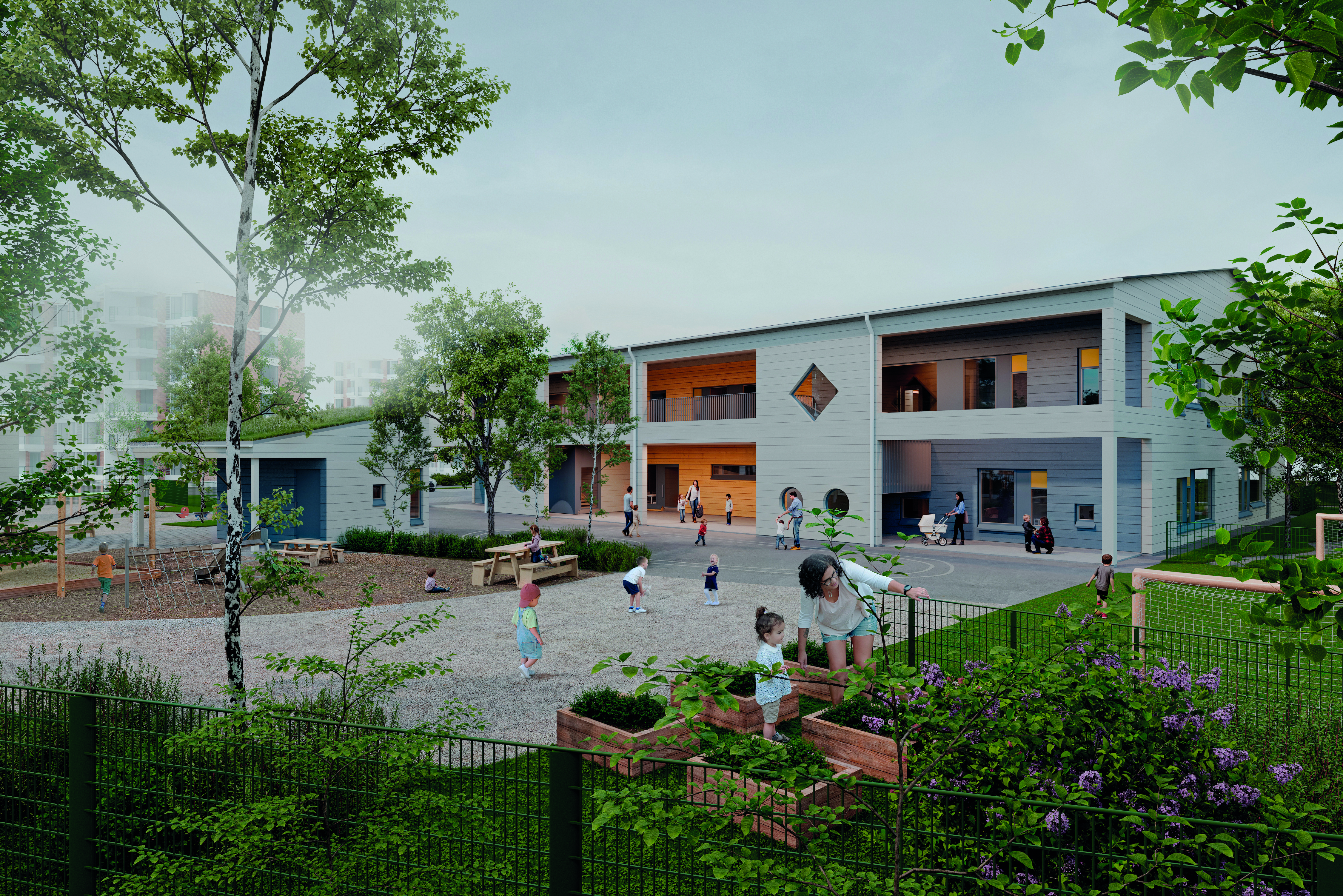 Vantaan kaupungille vuonna 2027 rakennettavan Sammakkolammen hirsipäiväkodin havainnekuva. Hoivarakentajat