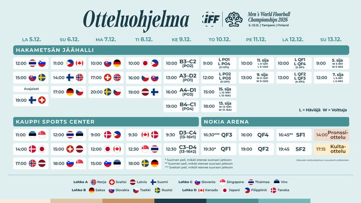 Joulukuun salibandyn MM-kisojen virallinen otteluohjelma on julkaistu