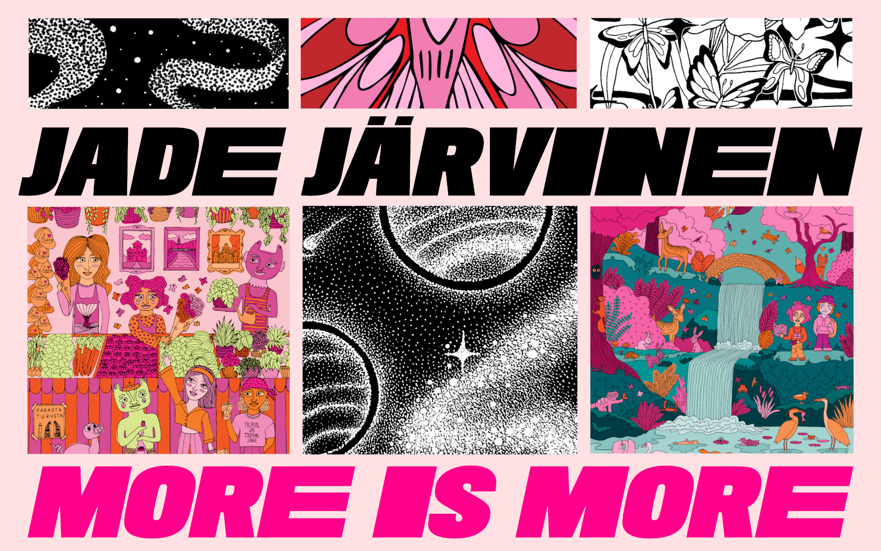 Taiteilija Jade Järvisen More is more -näyttelyssä Naantalin pääkirjastossa on nähtävillä värikkäitä, alun perin käsin tussilla paperille piirrettyjä julisteteoksia. Lisäksi esillä on Turun katukuvastakin tuttuja, ydinkeskustan parkkimittareiden kyljissä komeilevia teoksia.