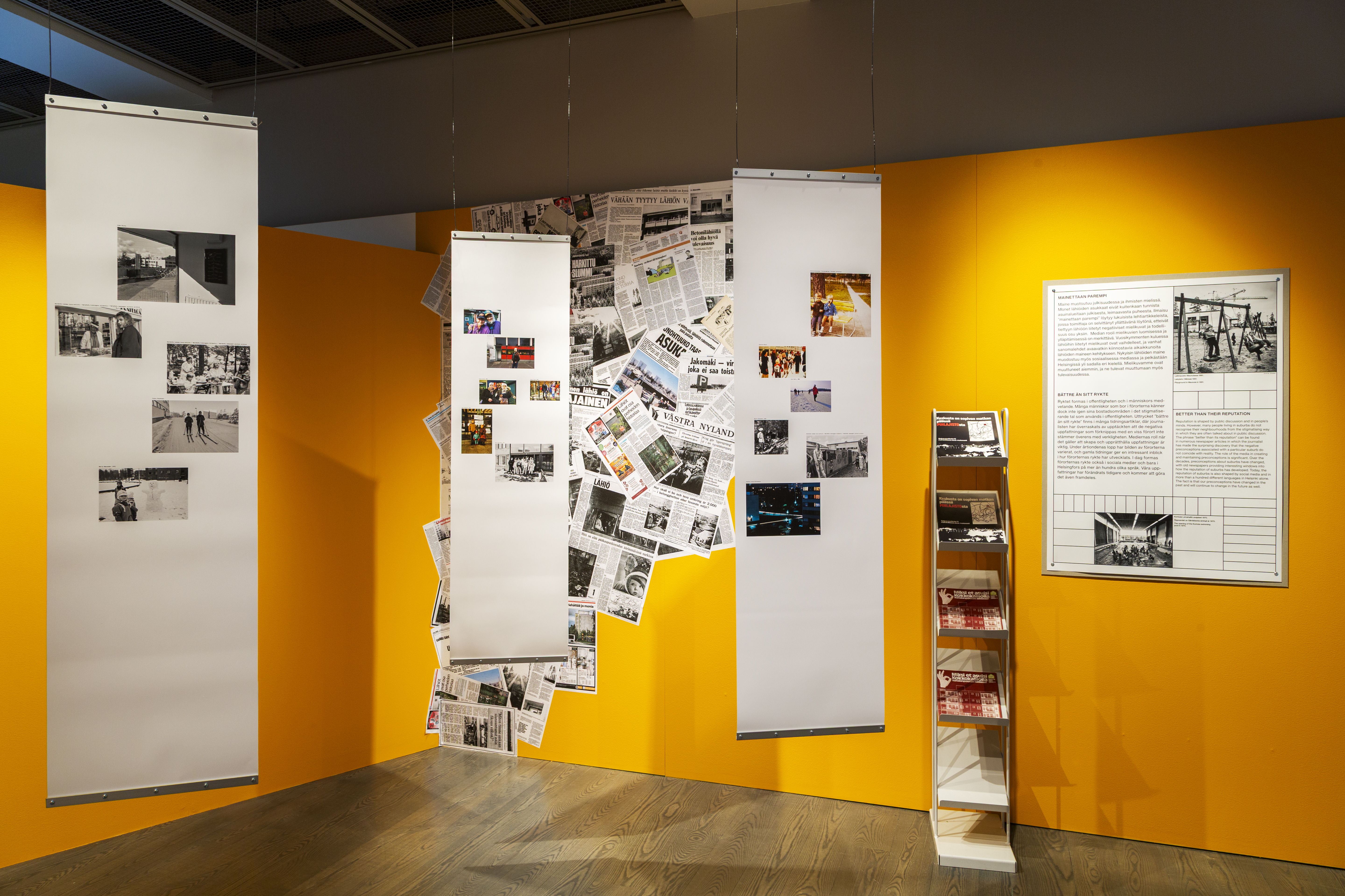 Kävijät pääsevät pohtimaan omia mielikuviaan lähiöistä lehtiotsikoiden ja lähiössä asuvien ihmisten kokemusten valossa.