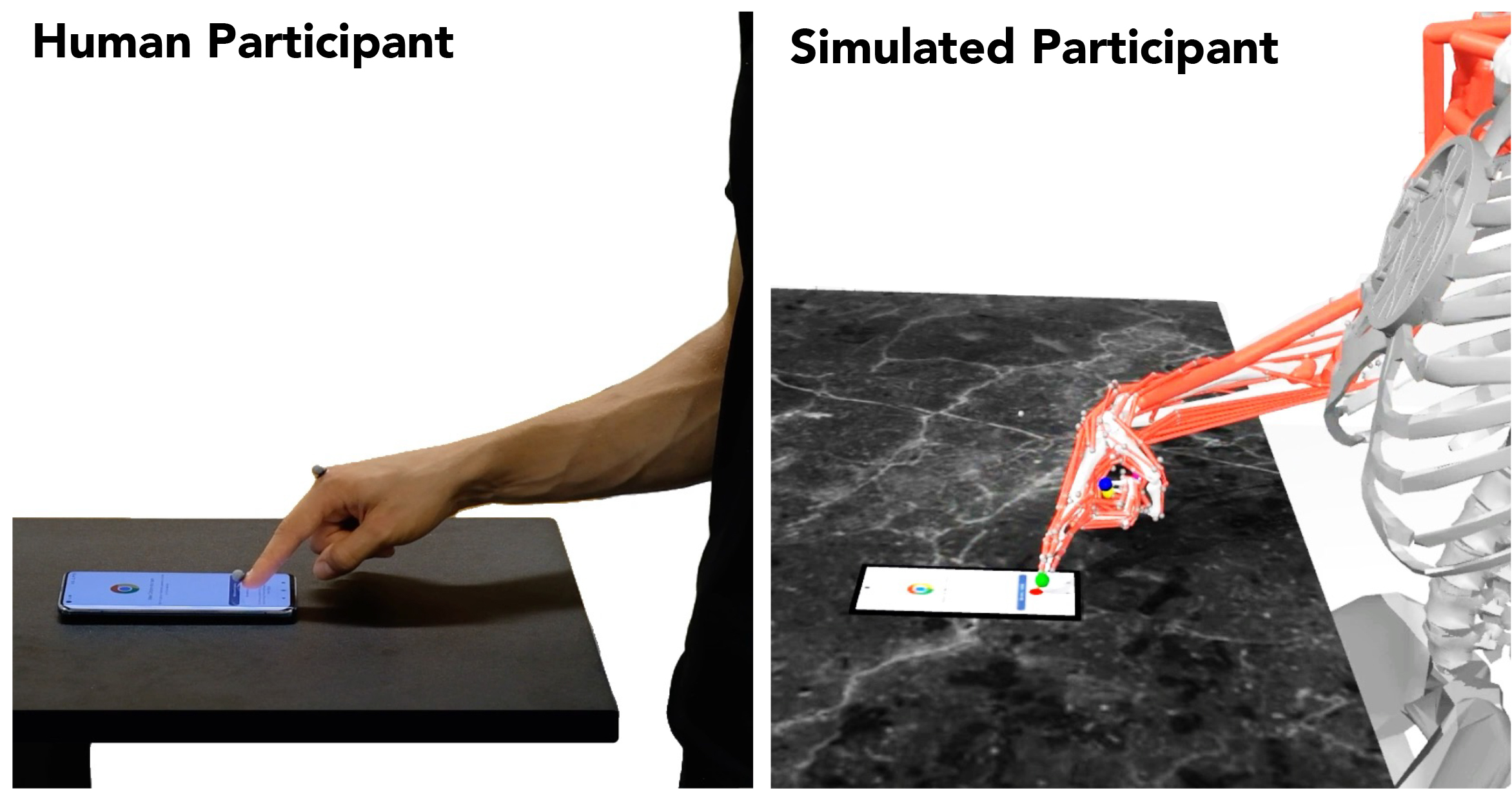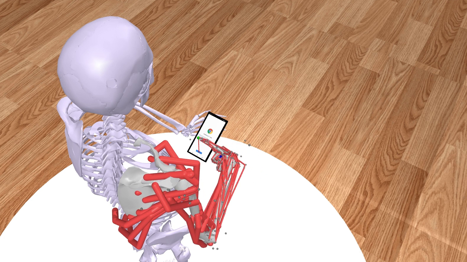 Simulaatiossa digitaalisista luista ja lihaksista koostuva mallinukke liikutti etusormeaan käyttäessään pöydällä lepäävää älypuhelinta. Tekoäly ohjasi liikettä niin, että se muistutti ihmisen liikettä. Ohjelmiston avulla nukke pystyi käyttämään oikeita mobiilisovelluksia reaaliajassa. Tällöin se kykeni myös toistamaan ihmiskäyttäjistä kerättyä dataa havainnollistaakseen, mitä tuki- ja liikuntaelimissä tapahtui puhelimen käytön aikana. Log2Motion-malli arvioi tämän biomekaanisen vuorovaikutuksen liikeradat, nopeuden, tarkkuuden sekä rasitusasteen.