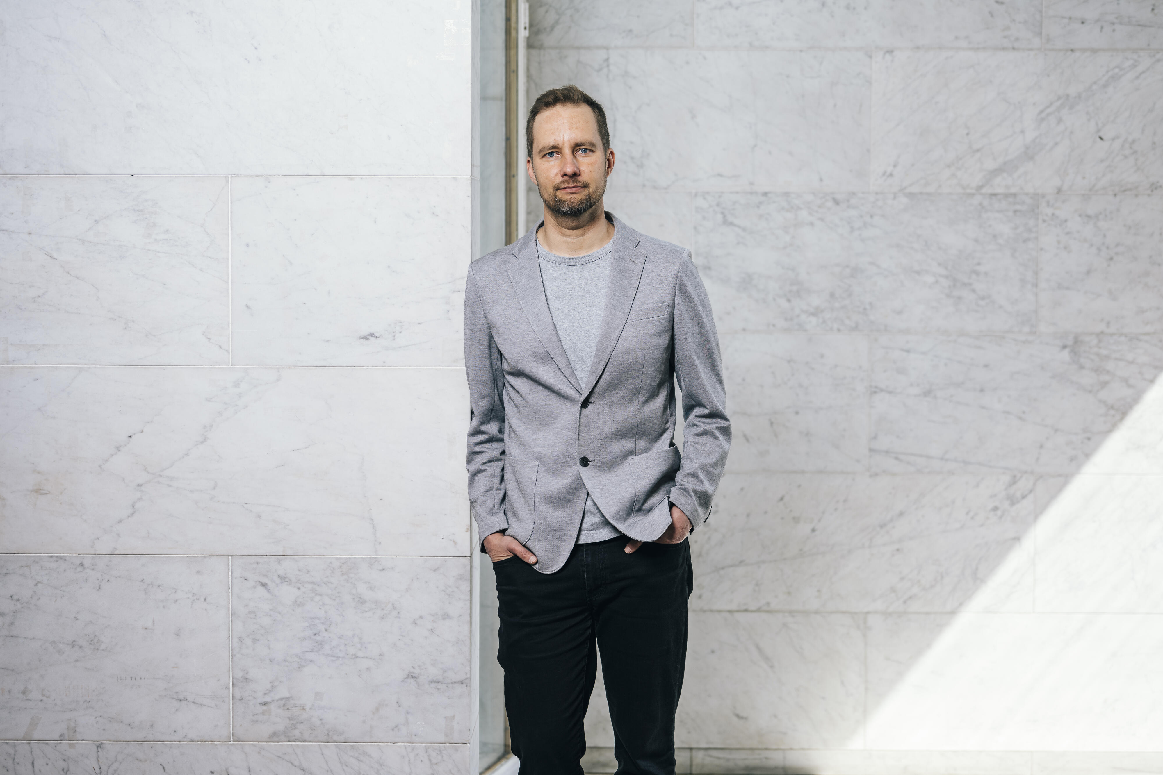 Henkilö seisoo vaaleaa kiviseinää vasten, pukeutuneena harmaaseen bleiseriin ja mustiin housuihin.
