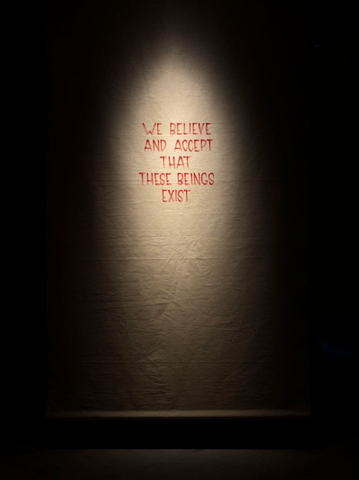 Uskomme ja hyväksymme näiden olentojen olemassaolon rakentuu moniulotteisesta vuoropuhelusta kirjoitetun ja puhutun sanan välillä. Museovieras kohtaa näyttelytilassa mielenosoitusbanderolleja muistuttavia suurikokoisia kankaita, joihin on käsin maalattu otteita Posadaksen puheesta. Sitaattien lomassa on videoita, jotka avaavat näkökulmia avaruustutkimukseen, poliittiseen historiaan ja ufologiaan. Asettamalla sanat teoksen keskiöön Straschnoy korostaa niiden voimaa poliittisten liikkeiden työkaluna sekä linkittää teoksen museorakennuksen historiaan entisenä painotalona. Vuoropuhelu kutsuu katsojaa suuntaamaan katseensa paitsi tähtiin, myös kohti tulevaisuuksia, joiden keskiössä ovat yhdenvertaisuus, yltäkylläisyys ja vapaus.