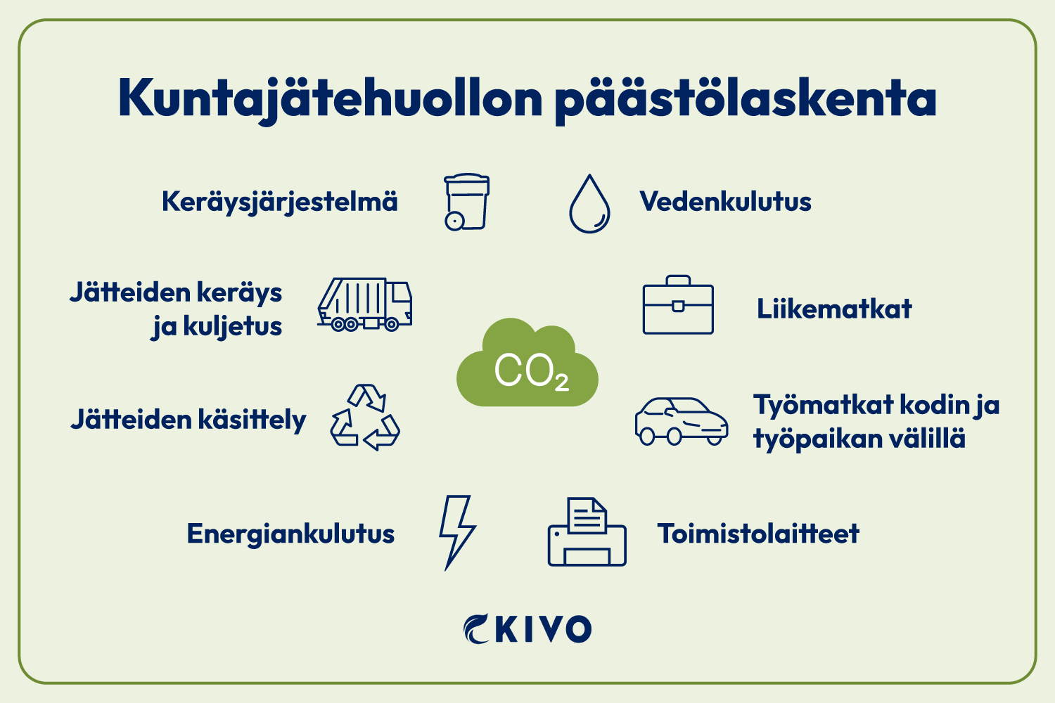 Suomen Kiertovoima ry KIVO on laajalla yhteistyöllä kehittänyt työkalun jäsentensä eli kuntien jätehuolto-organisaatioiden toiminnan päästöjen laskemiseen. Sen lisäksi, että hiilijalanjälkilaskurilla tehdään toiminnan päästöt näkyviksi, auttaa se kehittämään toimintaa päästöjen vähentämiseksi. Laskurin avulla asukkaiden jätehuoltoa järjestävät voivat siis kuvata lajittelun, kierrätyksen ja muun jätehuollon todelliset ilmastovaikutukset.