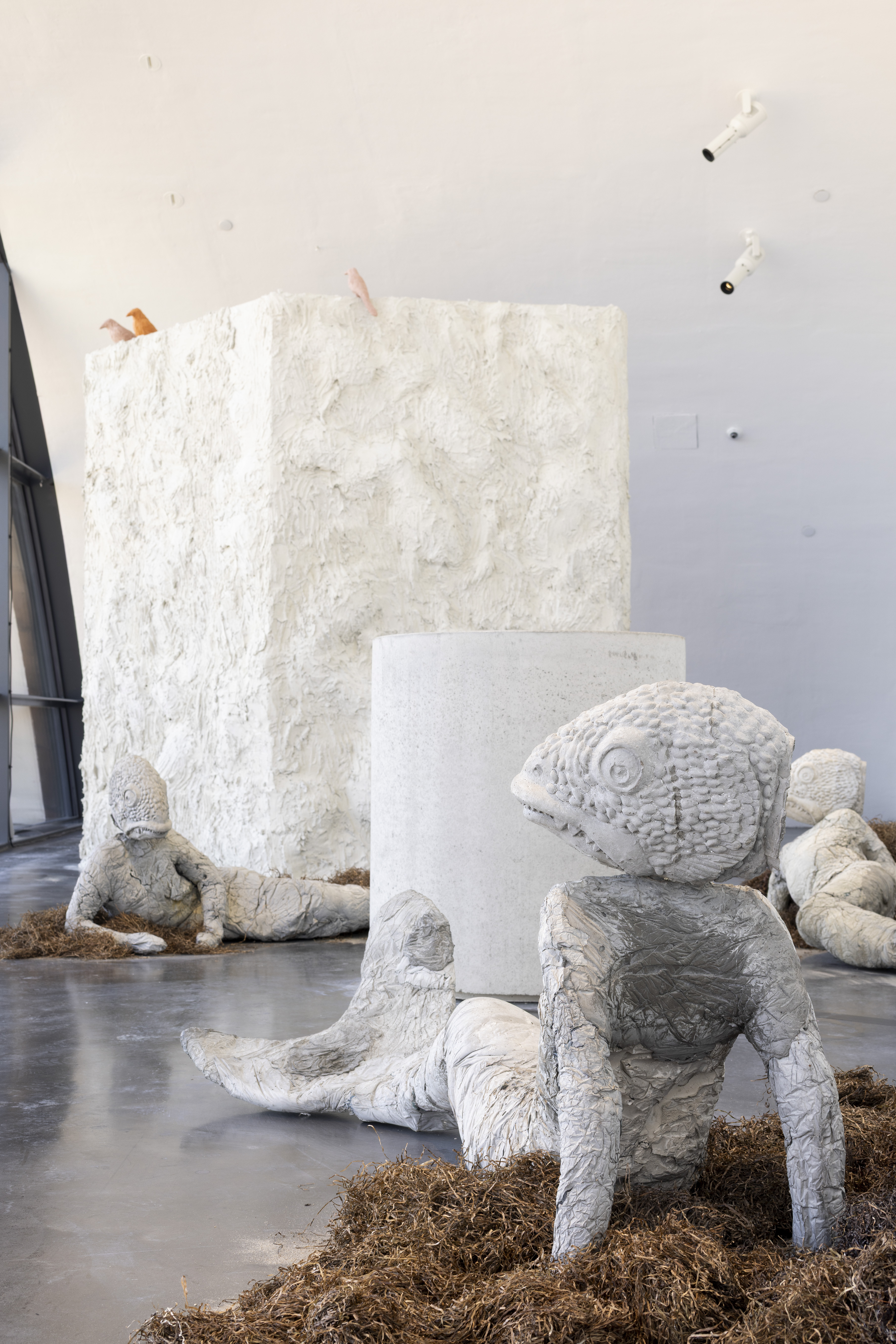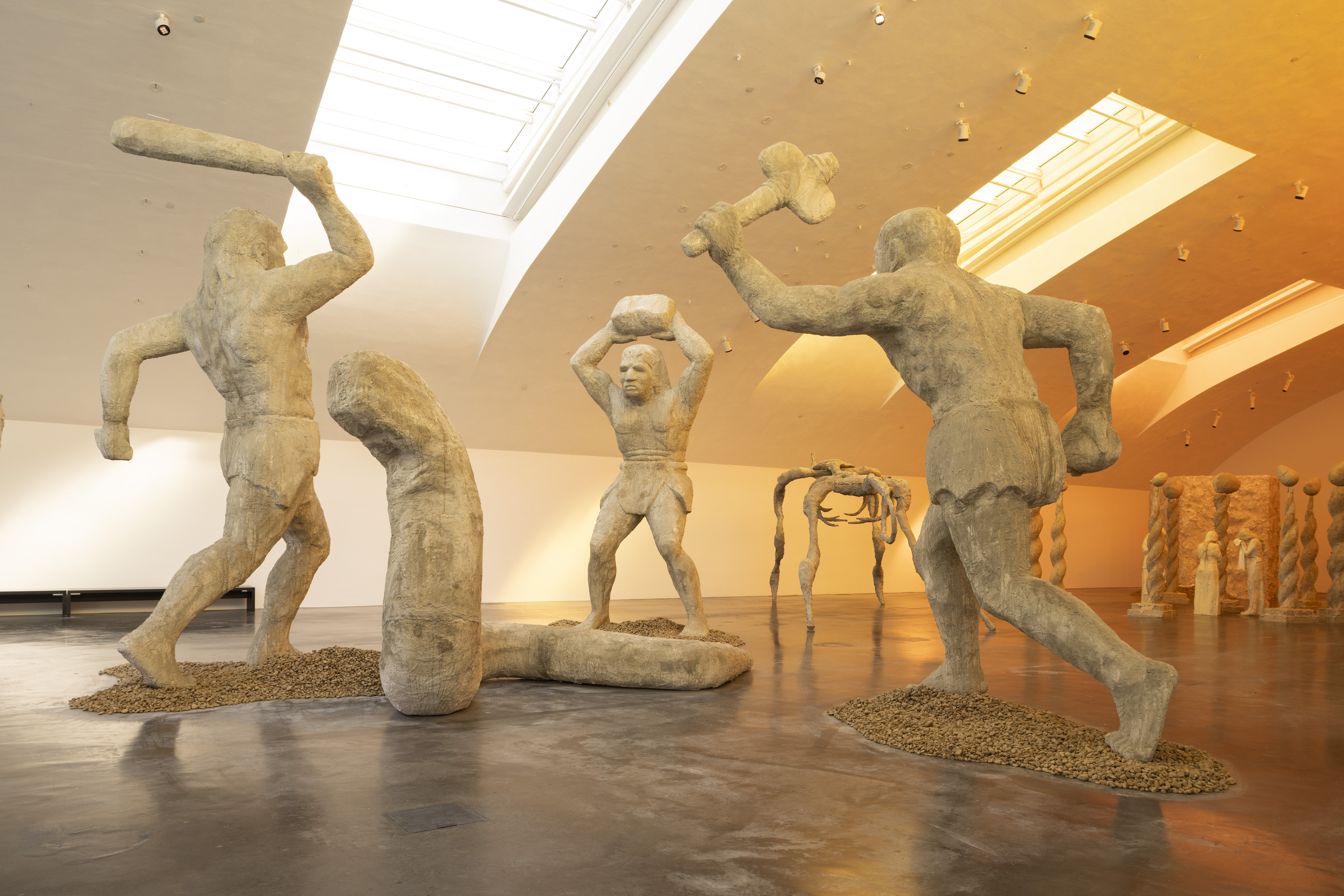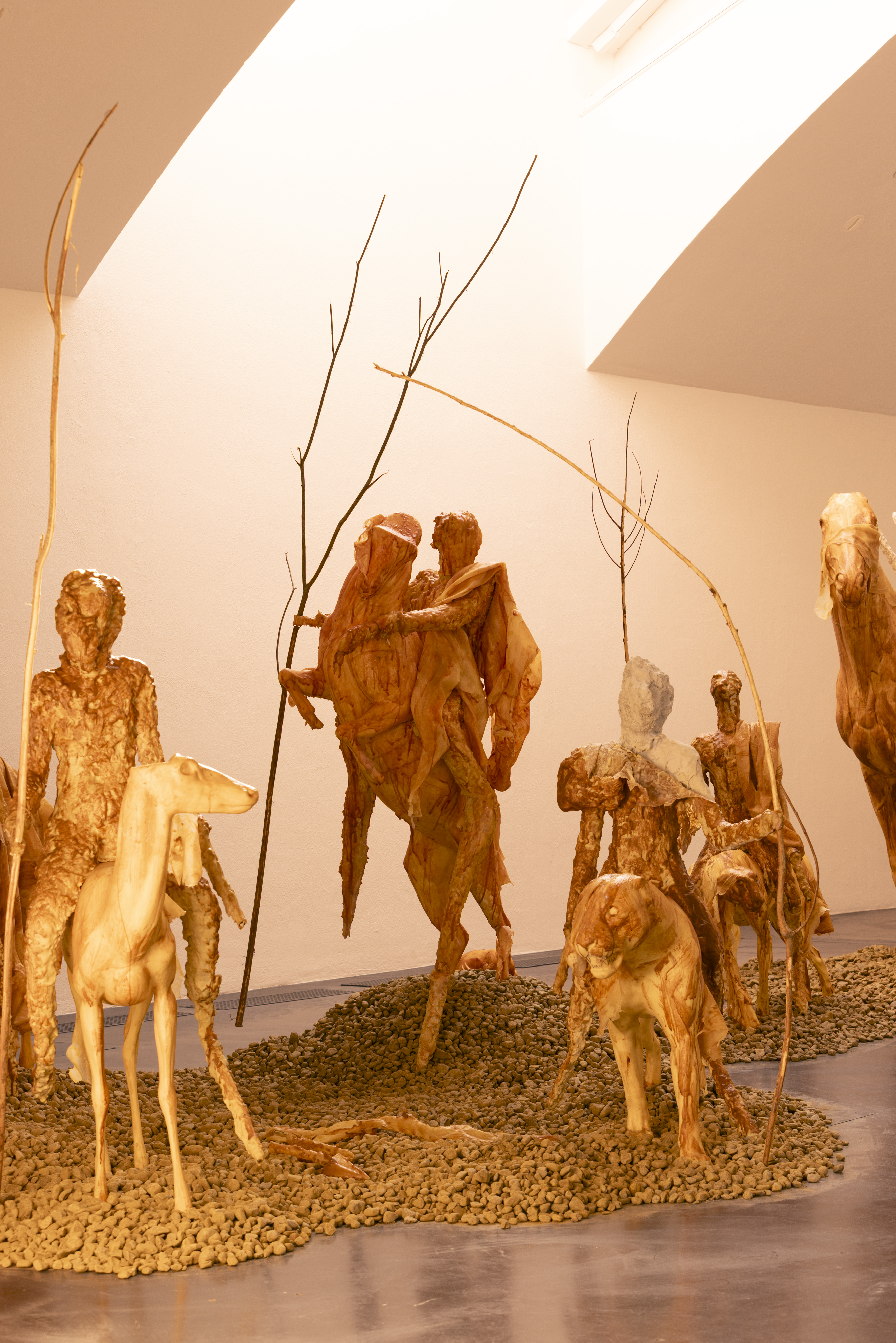 For Kiasma, Karlson has created a world inhabited by humans, animals, and mythical creatures. Visitors weave through sculptural groups as the lighting shifts from warm artificial yellow to natural daylight.