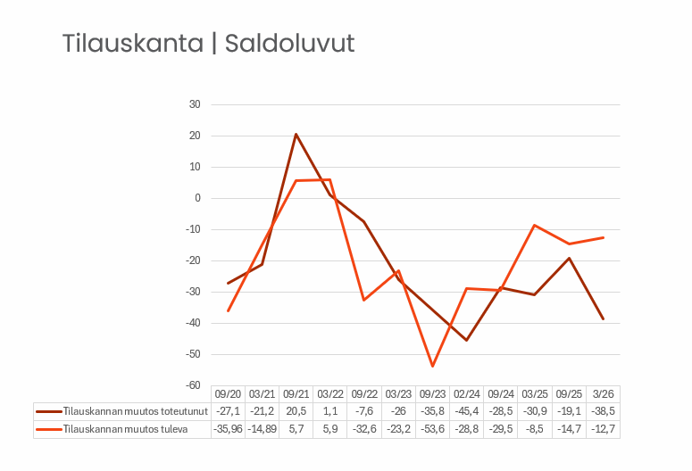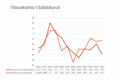 Tilauskannan saldoluvut osoittavat tilauskannan laskeneen viimeisen kuuden kuukauden aikana, ja laskun ennakoidaan jatkuvan. Toteutuneen tilauskannan kehitys on heikentynyt erityisesti pienemmillä toimijoilla, kun taas yli 10 miljoonan euron liikevaihtoa tekevät yritykset raportoivat jopa selkeää kasvua.